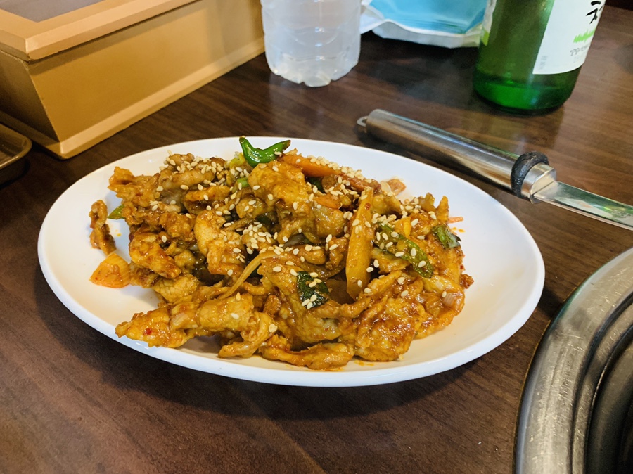 저녁시간에 방문하여 간단히 술안주를 추천해달라고 하니... 주물럭을 추천해주시더군요. 그래서 주물럭 1인분과 해물 된장 2인 주문했습니다. 주물럭은 테이블에서 익혀 먹지 않고, 조리해서 접시에 담아서 나오네요.