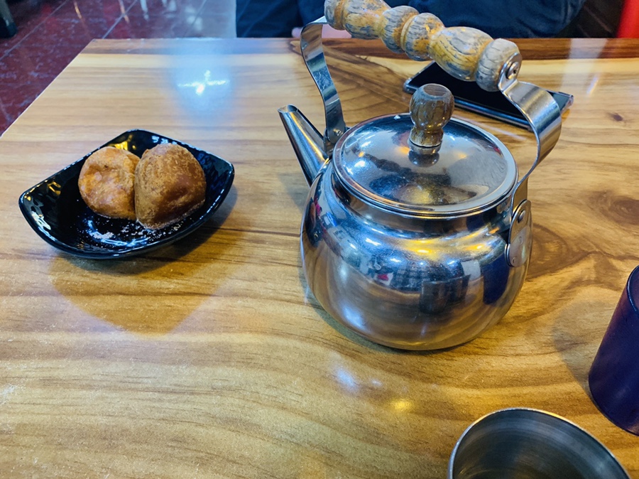 메뉴는 회/비빔/물냉면 3종류와 고기만두가 있습니다. 그리고, 동절기 메뉴를 별도로 판매하고 있더군요. 식당은 2개의 건물을 연결해서 사용하고 있는데, 식당은 넓은데 점심 식사 시간인데도 손님이 너무 없더군요. 가을이라 그런가? 왠지 손님이 없으니 불안해지네요.ㅎㅎ 비빔냉면을 주문하니 우선 찹쌀도넛과 면수가 나옵니다. 찹쌀도넛 맛이 괜찮더군요.ㅎㅎ