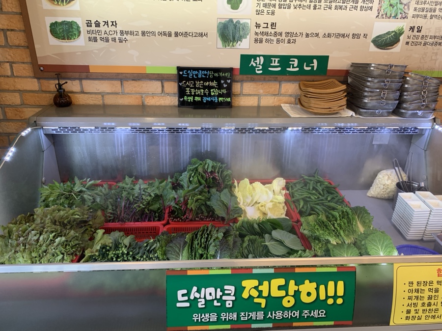 다양한 쌈 채소를 마음껏 먹을 수 있다는 점과 바로 한 밥을 먹을 수 있어서 좋았네요. 다만, 김치찌개는 무난한 맛이고, 제육볶음 양념은 매콤해서 좋은데... 기름이 너무 많아서 느끼했습니다.