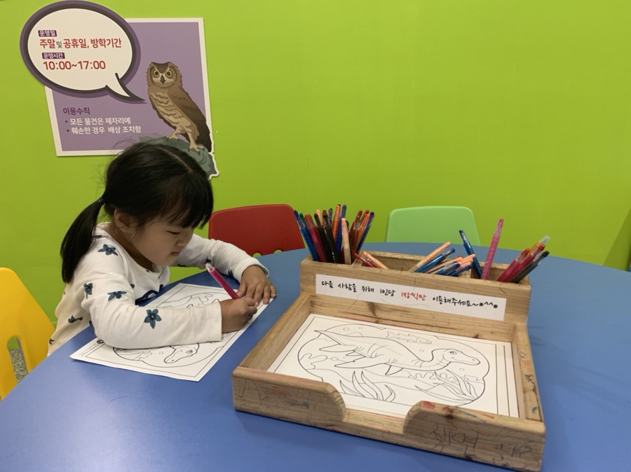 자연사박물관은 공룡과 역사관에는 공룡에 대한 전시물과 나비에 대해서 잘 정리가 되어 있습니다. 아이들은 전시관 보다는.... 4D 입체영사관을 보고 싶어하더군요. 4D 입체영상도 공룡에 관련된 내용으로 구성되어 있습니다. 목포 자연사 박물관은 공룡 말고는 특화?된 박물관으로 느껴지더군요. 그 외 무료체험으로 공룡 색칠하기와 지구의 위기 동물 맞추기 놀이가 설치되어 있습니다.