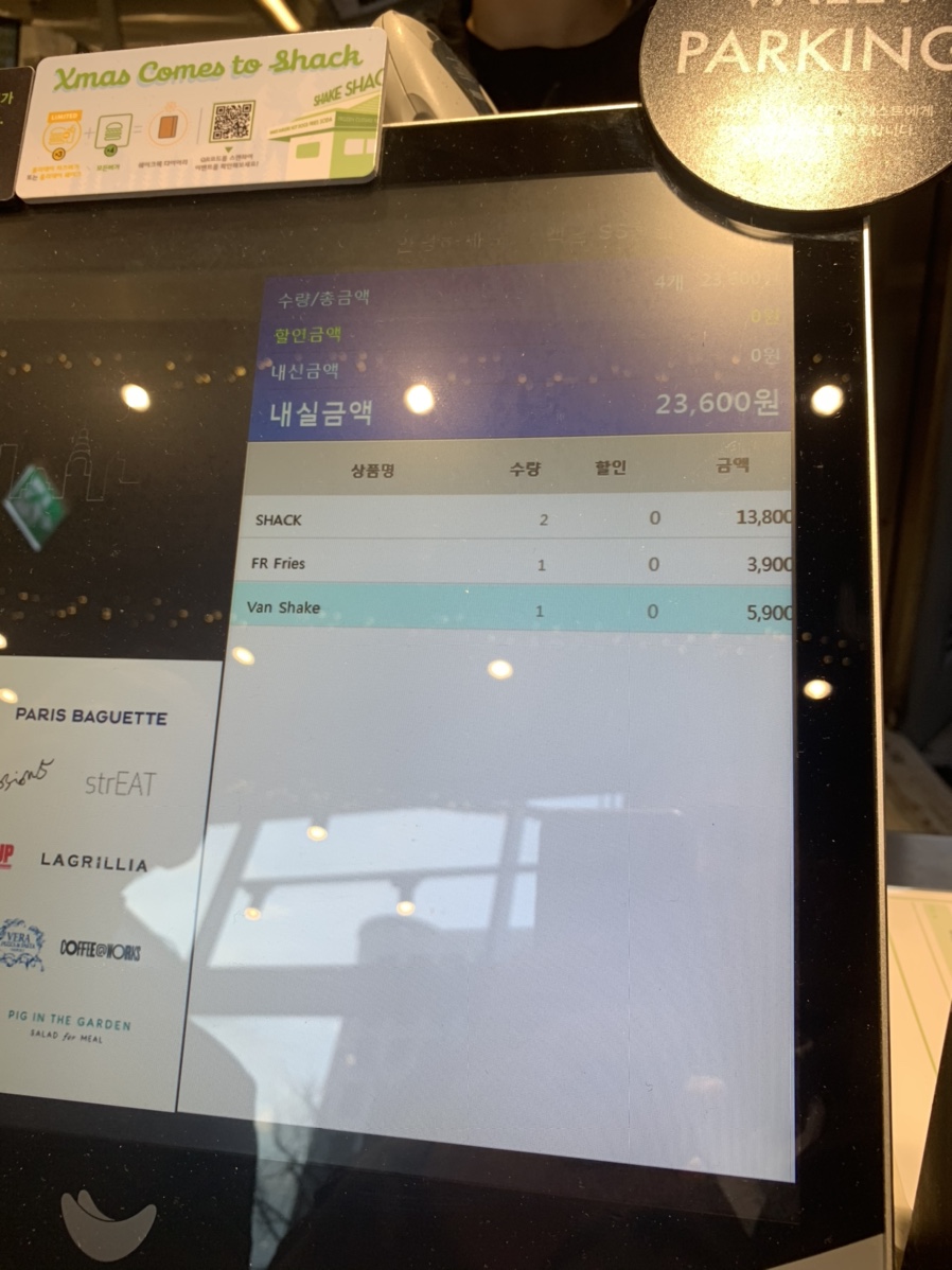 세트메뉴를 주문하려고 했으나, 세트메뉴가 없다고 하네요. 그래서 단품으로 6,900원 쉑버그 2개, 3,900원 감자튀김 1개, 5,900원 셰이크 1개 주문하니 23,600원이네요. 간식용으로 먹기에는 가격이 좀 비싸네요. 메뉴에 와인과 맥주도 있었는데..... 저녁에 맥주와 햄버거 먹는 맥주집이라고 생각하면 가격이 비싸게 느껴지지 않겠지만..... 간식으로 먹기에는 좀 비싼 편이네요.
