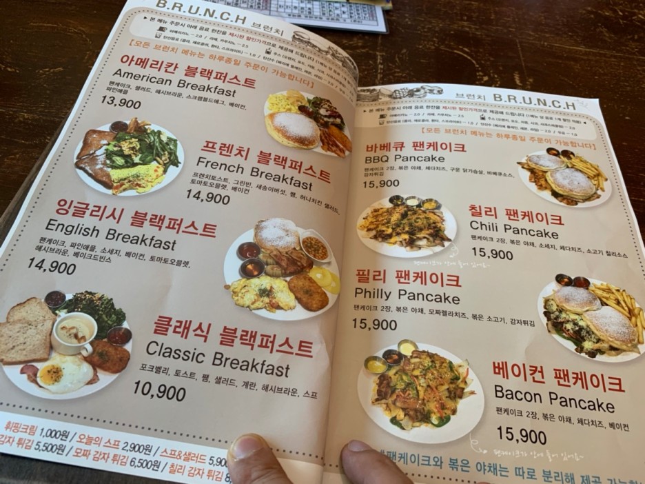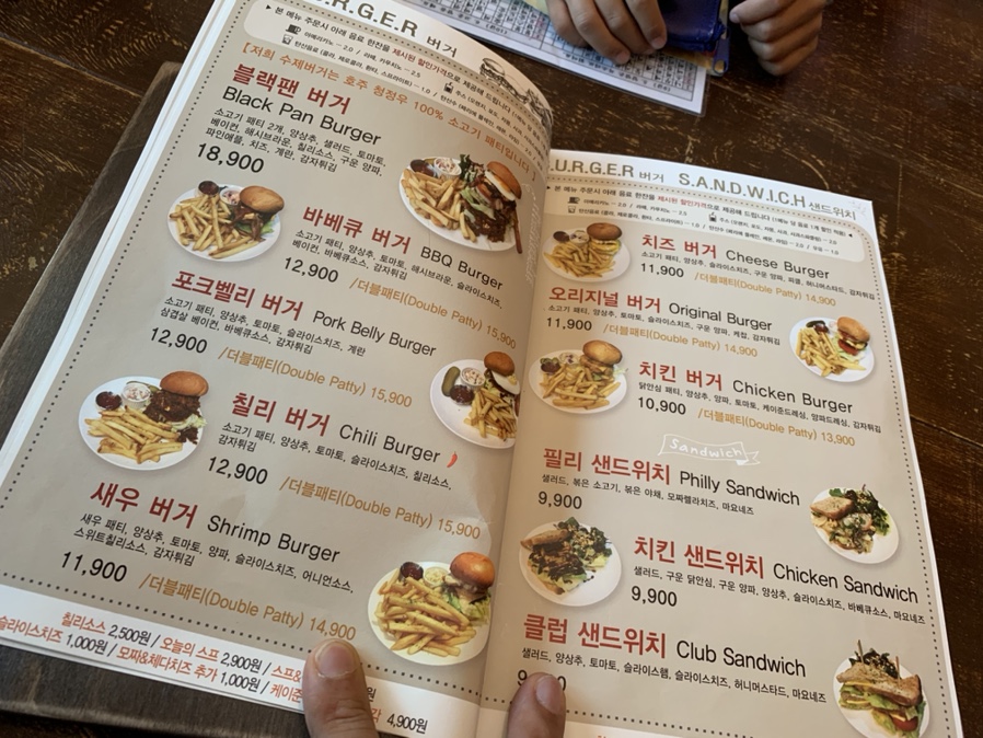메뉴판을 펼쳐보니.... 너무도 많은 메뉴!!! 무엇을 주문할지 고민하다 기본 팬케이크 6,900원, 버거 18,900원, 새우볶음밥(슈림프 필라프) 11,900원 하나씩 주문해 보았습니다. 버거 하나에 18,900원 좀 비싼 느낌이 드는 햄버거이네요. 맛은 좋을 거라는 기대하며~ 그 순간 오리지널 팬케이크와 새우볶음밥이 나왔습니다.