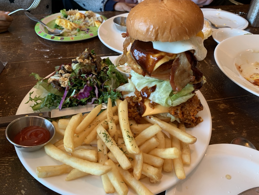햄버거는 패티가 너무 퍽퍽해서 먹기 부담스러웠습니다. 기대를 많이 있던 팬캐익은 밀가루 향기가 가득 나서.... 그나마 먹을만했던 게 새우볶은밥이었네요. 여기는 음식 맛보다는 분위기가 괜찮아서 오는 식당이네요~