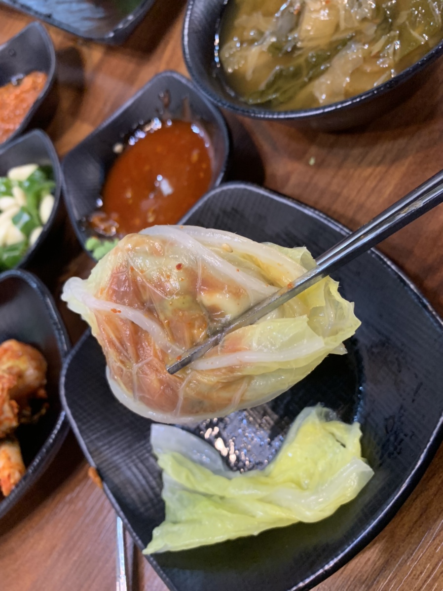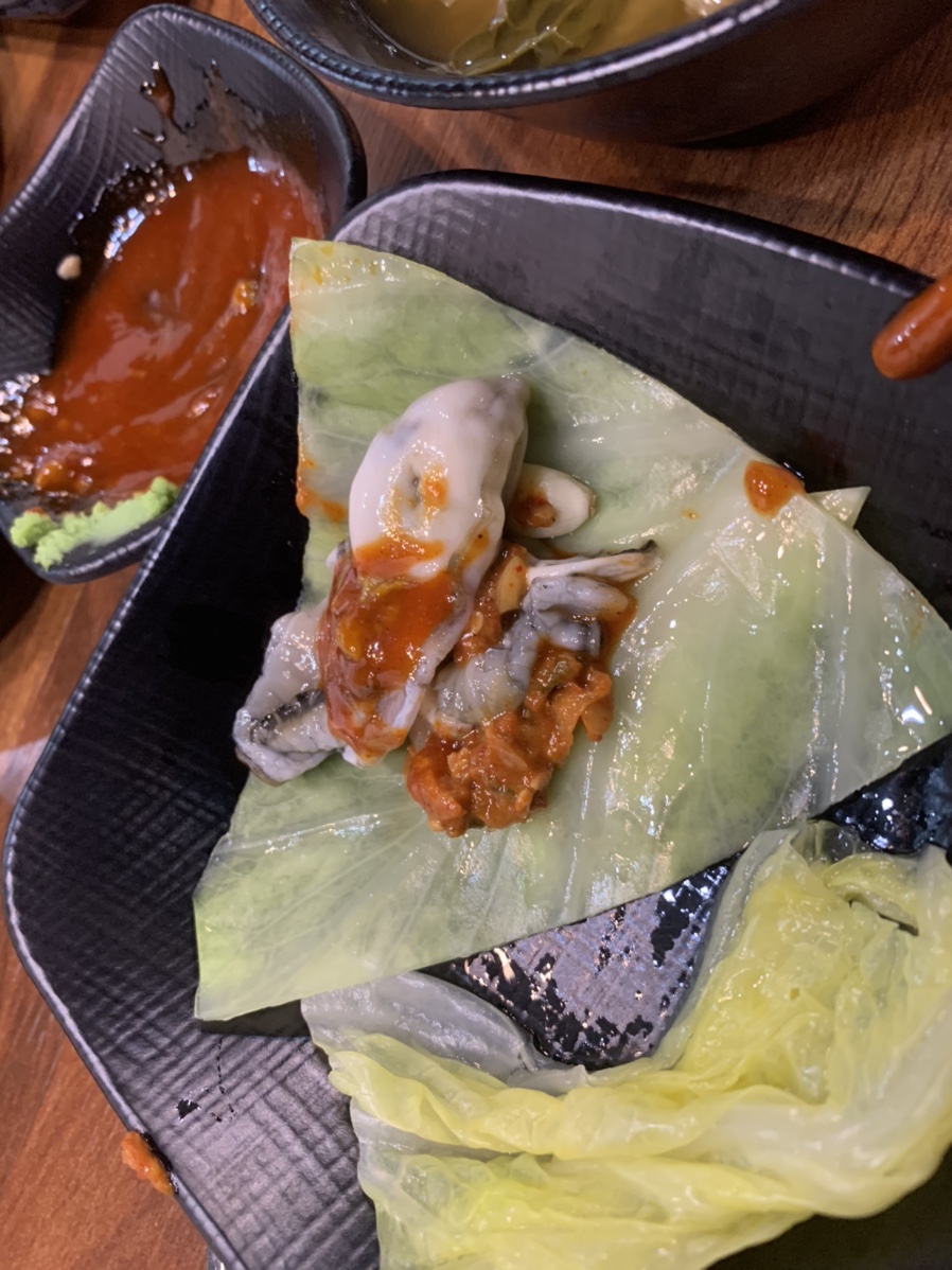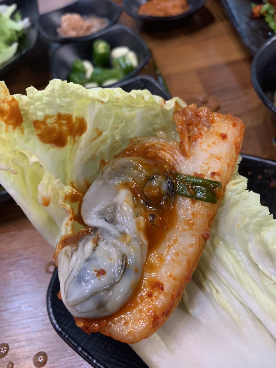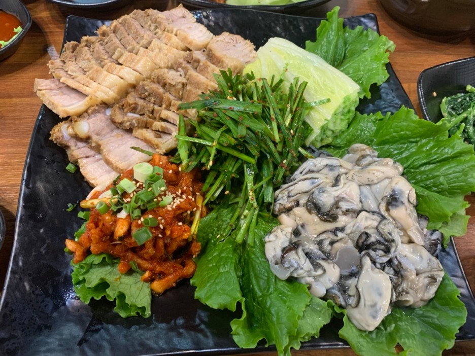 삼겹 보쌈 고기는 약간 두툼하게 나왔는데.... 크기가 좀 작게 썰어져 나왔으면 좋겠더군요. 보쌈만 먹는 게 아니라 굴까지 함께 싸먹으려면 고기가 약간 얇아야 함께 싸먹기 좋은데... 고기 크기가 얇은 거 몇 개에 대부분 두툼에서 굴과 함께 먹기는 안 좋더군요. 더욱이 함께 싸먹을 쌈 재료도 배춧잎이 나왔는데 배춧잎도 좋지만 상추나 깻잎이 있었으면 더 좋겠다는 생각이 들더군요.