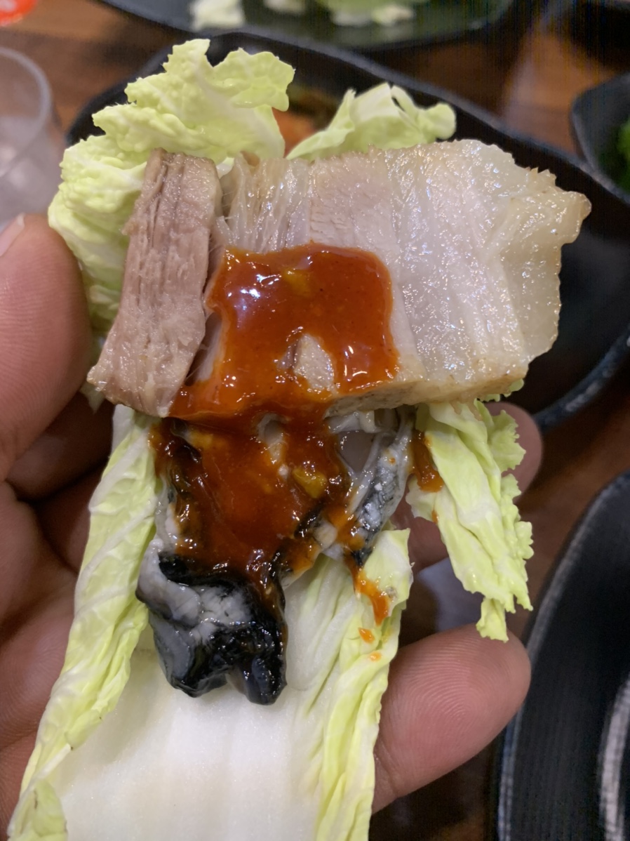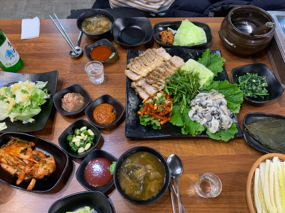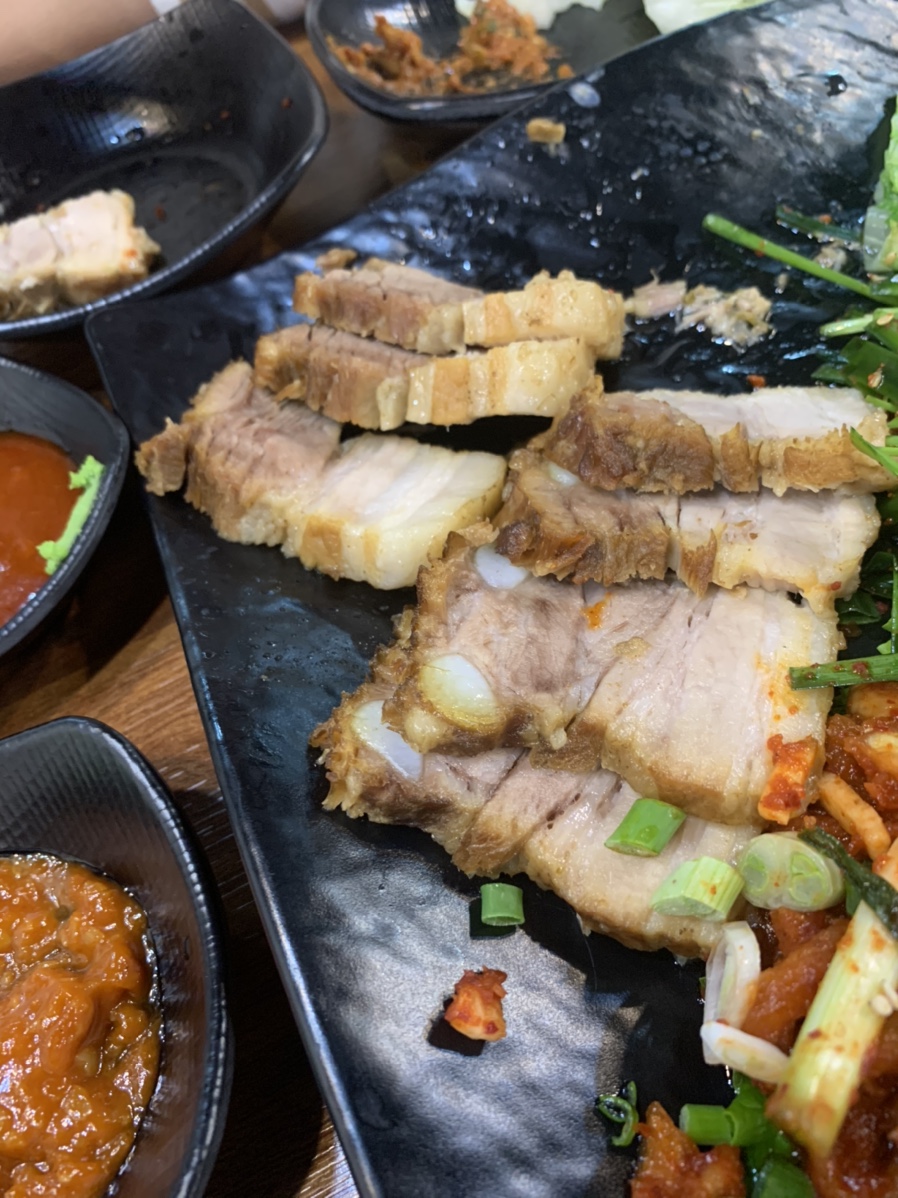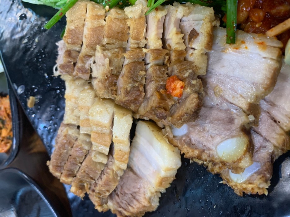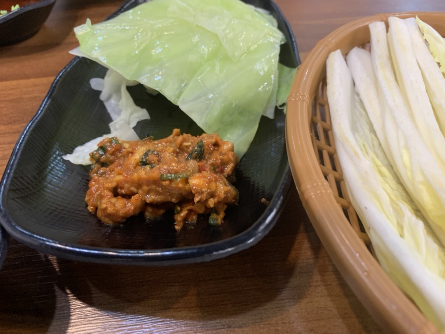 삼겹 보쌈 고기는 약간 두툼하게 나왔는데.... 크기가 좀 작게 썰어져 나왔으면 좋겠더군요. 보쌈만 먹는 게 아니라 굴까지 함께 싸먹으려면 고기가 약간 얇아야 함께 싸먹기 좋은데... 고기 크기가 얇은 거 몇 개에 대부분 두툼에서 굴과 함께 먹기는 안 좋더군요. 더욱이 함께 싸먹을 쌈 재료도 배춧잎이 나왔는데 배춧잎도 좋지만 상추나 깻잎이 있었으면 더 좋겠다는 생각이 들더군요.