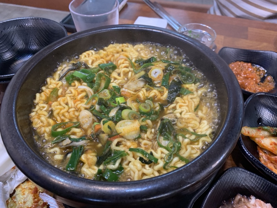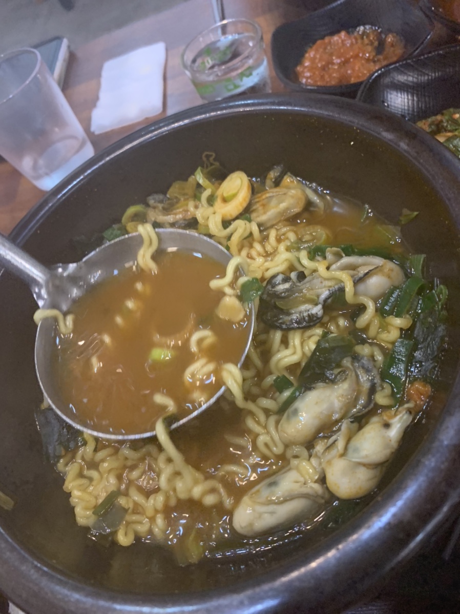 국물이 필요해서 추가 주문한 6,000원 굴 라면~ 라면에 굴 넣어서 끊인 거라 특별하게 맛 표현을 못 하겠네요^^ 그나마 직접 담그신 배치 김치가 매콤하니 라면과 함께 먹기에는 좋았네요. 그 외 딱히 좋았던 부분은.........