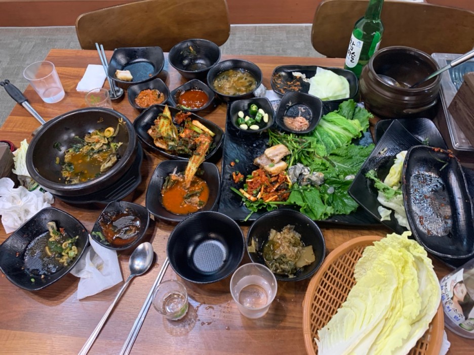 굴선생 삼겹 보쌈 식당의 주메뉴인 생굴보쌈을 주문했습니다. 가격이 중이 35,000원, 대가 43,000원인데 2인으로 중 35,000원으로 주문하게 되었네요. 소가 있었으면 좋았는데... 음식을 주문하고 기본 반찬으로 된장찌개와 김치, 샐러드와 쌈재료가 나왔습니다.