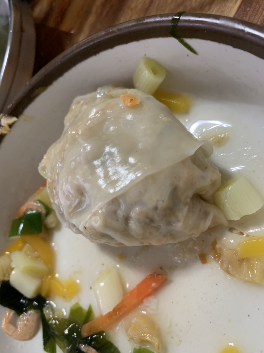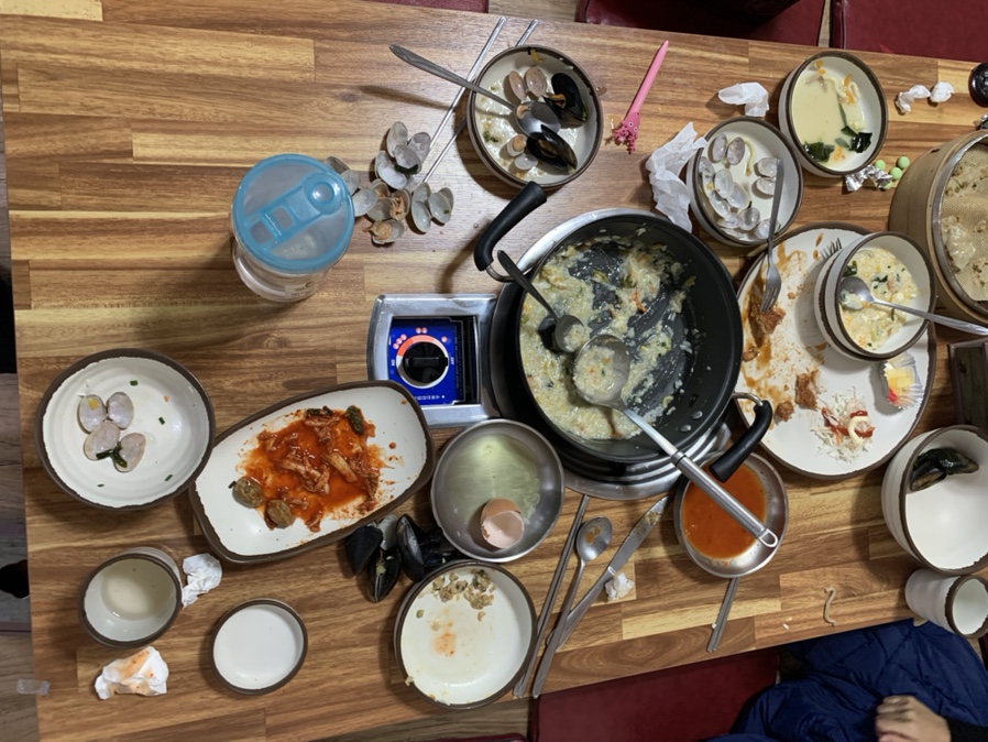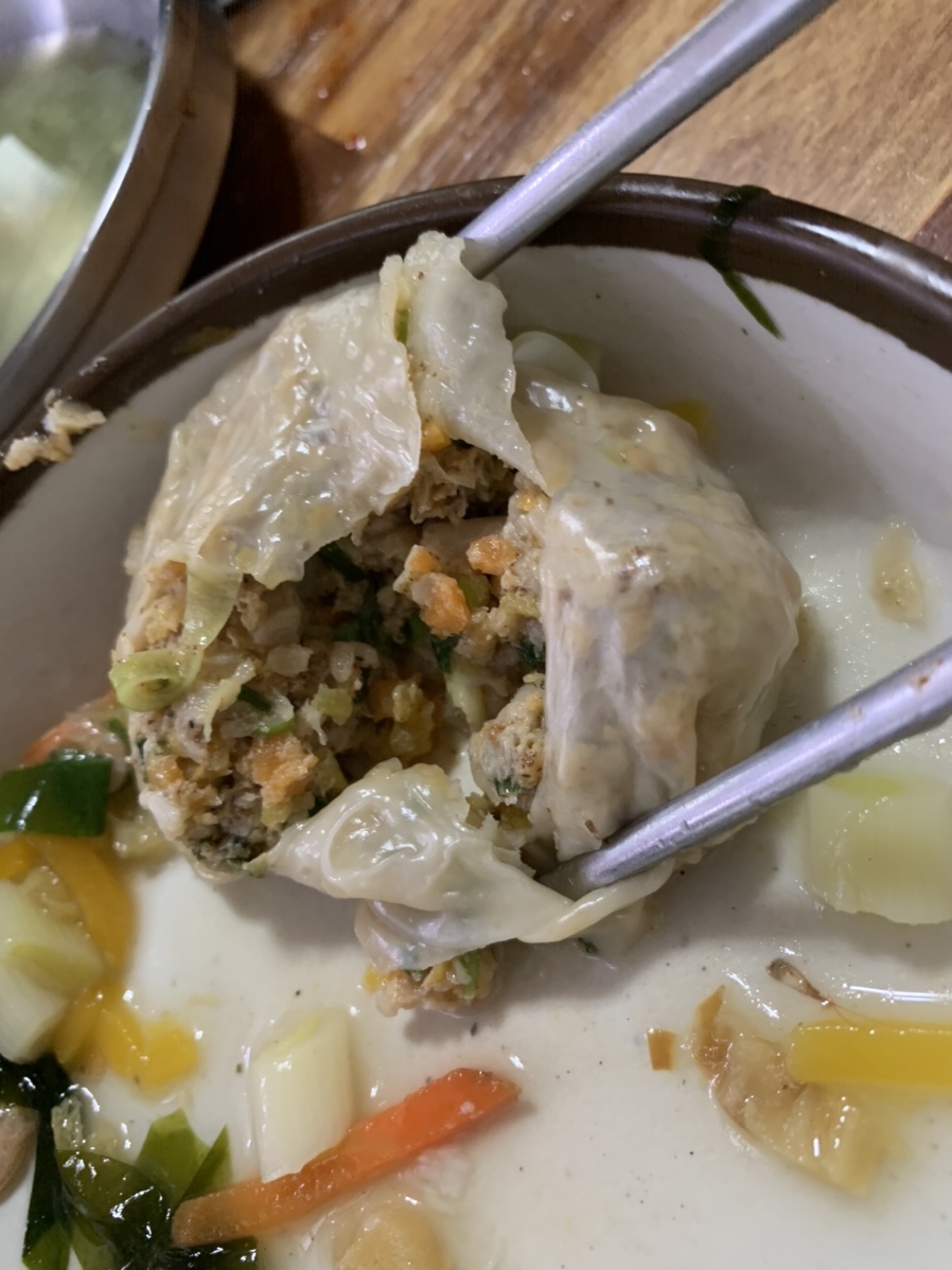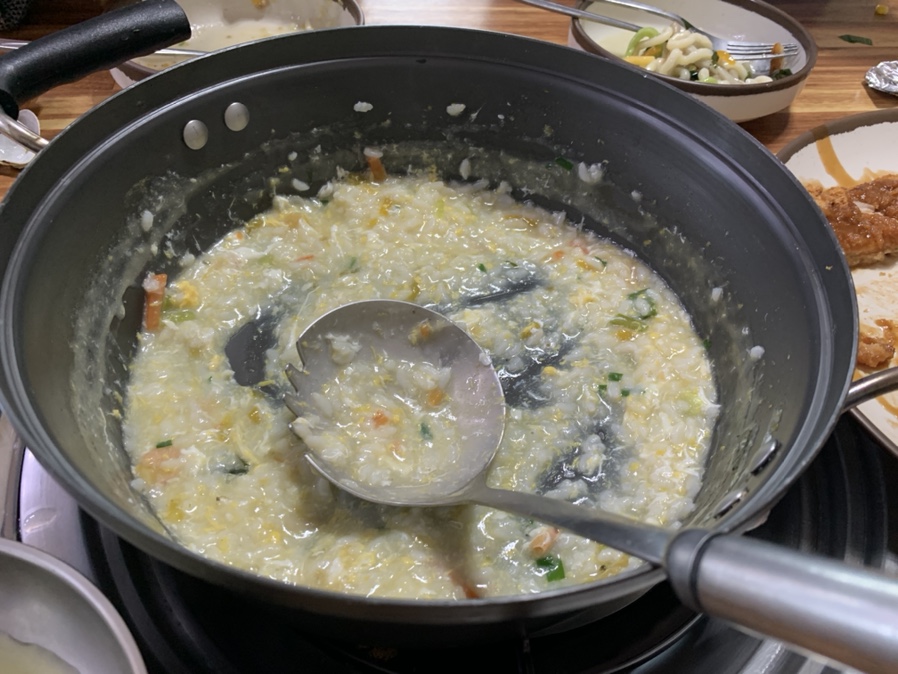 아이들용 돈가스는..... 대표 메뉴가 아니다 보니 패스~ 왕만두는 만두피가 너무 얇아서 만두를 조심히 들어서 만두피가 터져서;;; 만두피를 얇게 만드는 것 까지는 좋은데 만두피가 찢어지는 건 에러;;; 만두피가 찢어져서 만두의 육즙이 흘러내렸는지는 몰라도.... 만두는 좀 퍽퍽한 느낌이더군요. 칼국수는 다 먹을 즘 함께 나온 달걀과 공깃밥으로 만드는 셀프 죽은 칼국수 육수가 맛있어서 그런지 맛이 좋았네요.