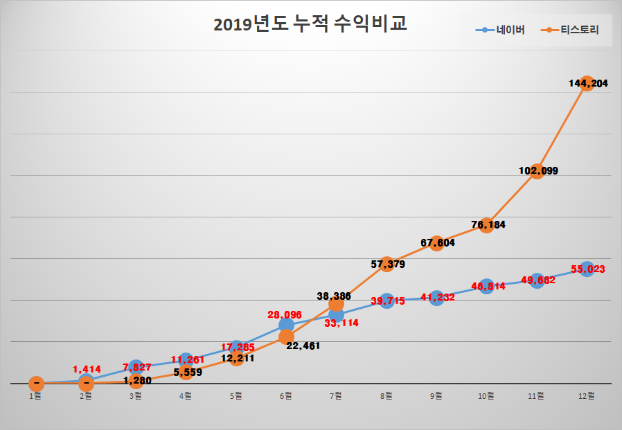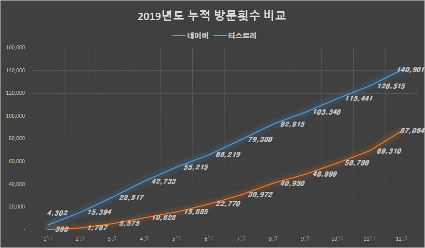 2019년도 누적 방문 횟수는 당연 네이버의 압승입니다. 네이버는 1월 4,302명을 시작으로 12월까지 누적 방문 횟수는 140,901명으로 마감하였고, 티스토리는 1월 390명으로 시작하여 12월까지 누적 방문 횟수는 87,064명으로 마감하였습니다. 네이버는 블로그를 시작한 1월을 제외하고 모두 1만 명 이상 꾸준히 방문하였습니다. 티스토리는 초반에 방문자 수가 너무 적어서.... 티스토리를 아예 접을까?라는 생각도 많이 했었는데, 티스토리를 약 6개월 이상 지나니 네이버와 비슷하게 방문 횟수를 기록하였고, 12월에는 티스토리가 오히려 앞서기도 했었습니다. 이제 네이버를 접을까?라는 생각을 하게 되는군요.
