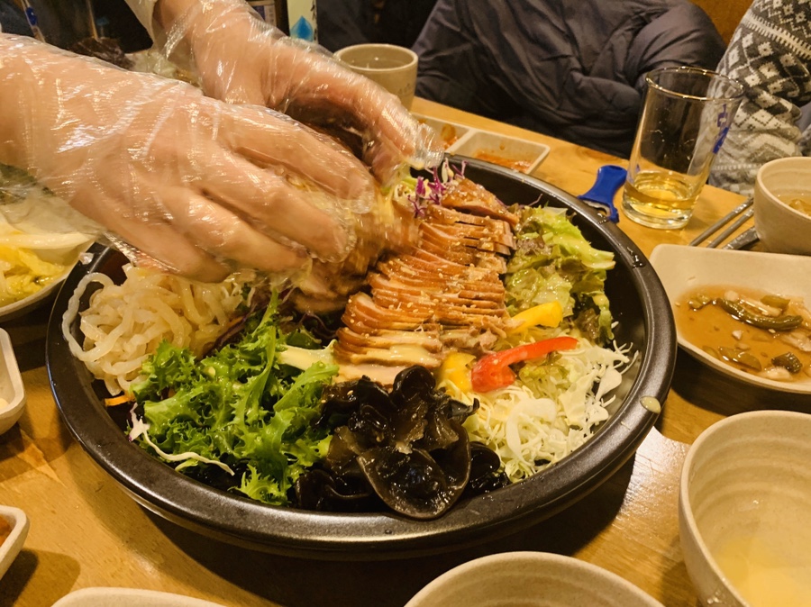 추가로 주문한 족발은 냉채족발 대로 35,000원으로 주문했습니다. 함께 나온 겨자소스를 모두 넣었는데.... 상당히 겨자 맛이 느껴지더군요. 지나가던 사장님이 처음부터 겨자소스를 다 넣지 말고 먹으면서 조절하라고 뒤늦게 말씀해 주시더군요. 겨자 맛이 너무 강해서.... 이야기하니 채소를 추가해서 다시 버무려 주시더군요. 야채를 추가하고서야 먹을만해지더군요.