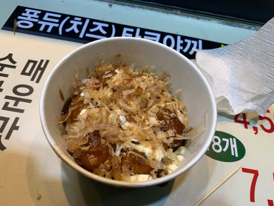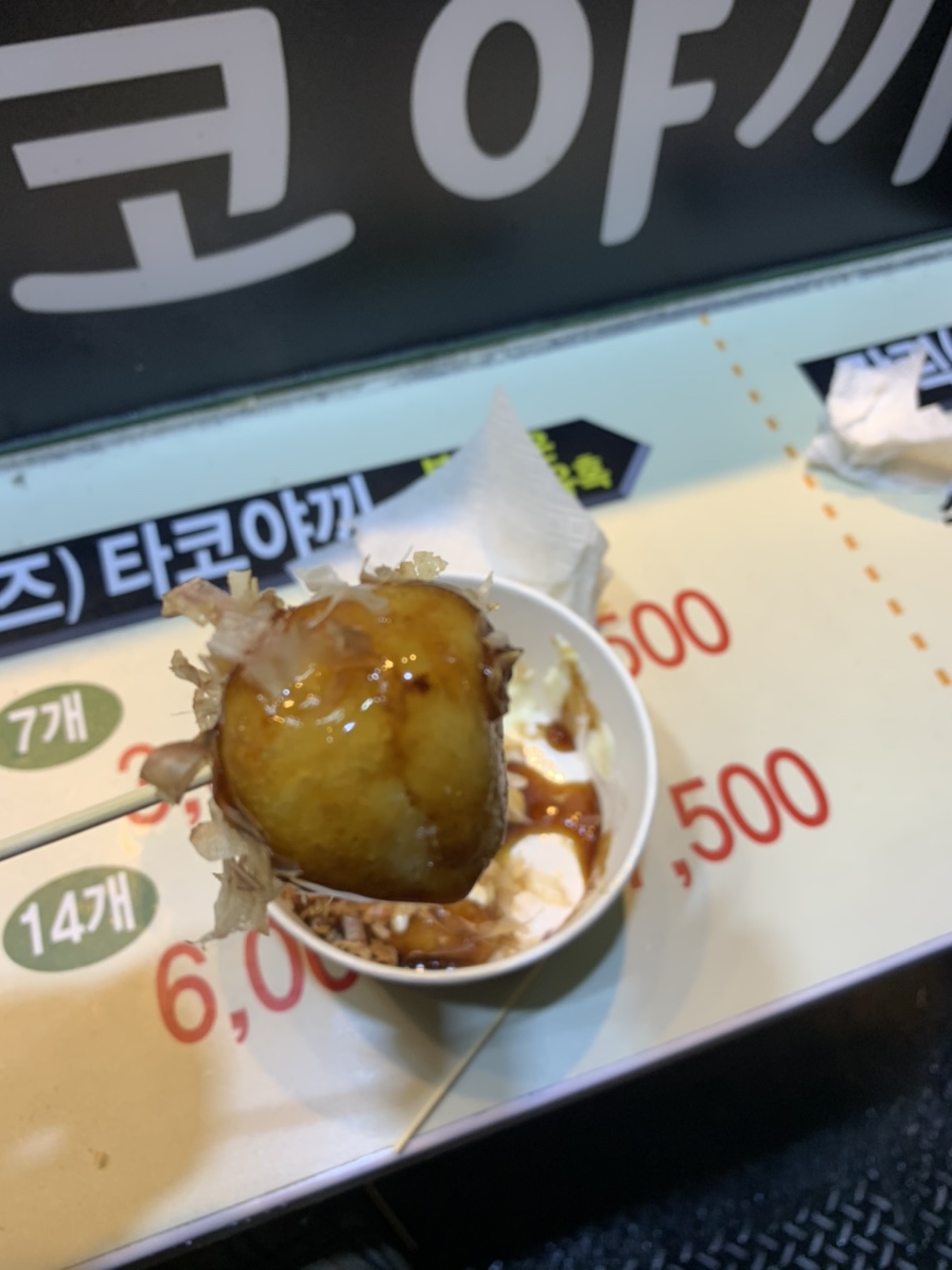 일단 일본에서 먹었던 다코야키에 비해서 가격은 엄청 저렴한 편이네요.ㅎㅎ 다코야키의 토핑은 여러 가지 있었는데... 토핑보다는 다코야키는 기본 반죽이 중요하기에.... 반죽이 죽 느낌이 나더군요. 역시 타고 아끼는 내 입맛에는 안 맞나 봅니다. 나는 좀 겉은 바삭하고 속은 부드러운 식감을 생각했었는데.... 겉과 속이 부드러운 식감, 이게 식감으로만 느껴지는 게 아니라 조금 덜 익은 느낌이 들어서 약간 먹기가 부담스러웠습니다.