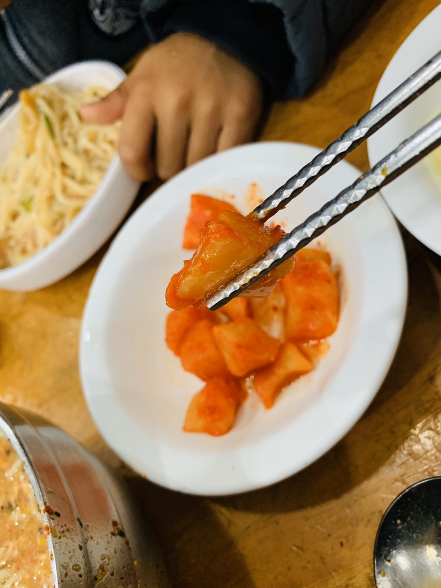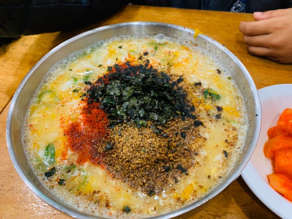 베테랑 칼국수의 고명으로 김가루, 들깨가루, 고춧가루가 올려져 있는데 이 고명중 들깨가루를 아이가 좋아하더군요. 어렸을 때부터 국물에 들어있는 들깨만 골라서 먹을 정도이니.... 그리고 베테랑 칼국수의 계란을 풀어헤친 국물은 제가 좋아하는 스타일이네요. 맑은 국물도 좋지만, 달걀을 풀어해 져 처 고소한 맛? 이 저는 좋더군요. 칼국수와 함께 먹으면 일품인 깍두기!!! 예전에는 깍두기가 맛있어서 여러 번 추가해서 먹었는데.... 이제 깍두기가 너무 쉰 맛이 느껴지더군요.ㅠㅠㅠ