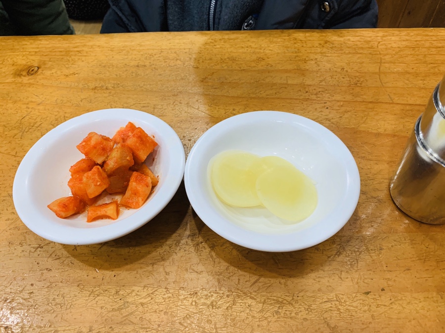 칼국수는 7,000원으로 불과 1년 전에는 원재료 값 인상으로 인하여 한시적으로 500원 인상한다는 안내 문구가 보였는데, 이제는 문구는 사라지고 칼국수 가격이 7,000원으로 고정되었네요. 전주 객리단 길에서 이미 점심 식사를 마치고 방문하여 아이가 먹고 싶다던 칼국수 하나만 주문해 보았습니다. 칼국수를 주문하고 밑반찬으로 깍두기와 단무지가 나오네요.