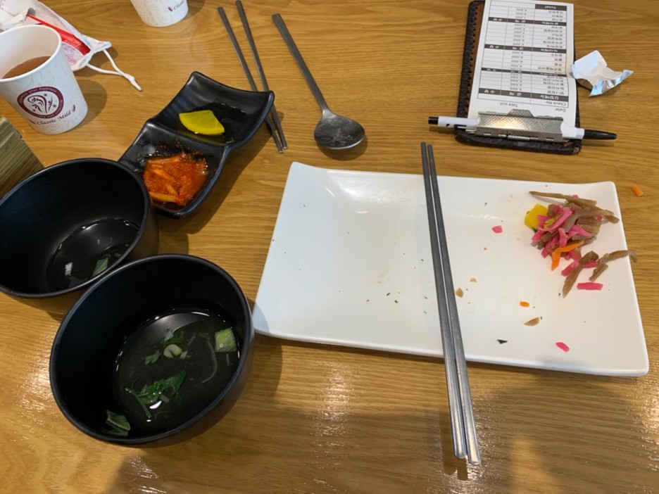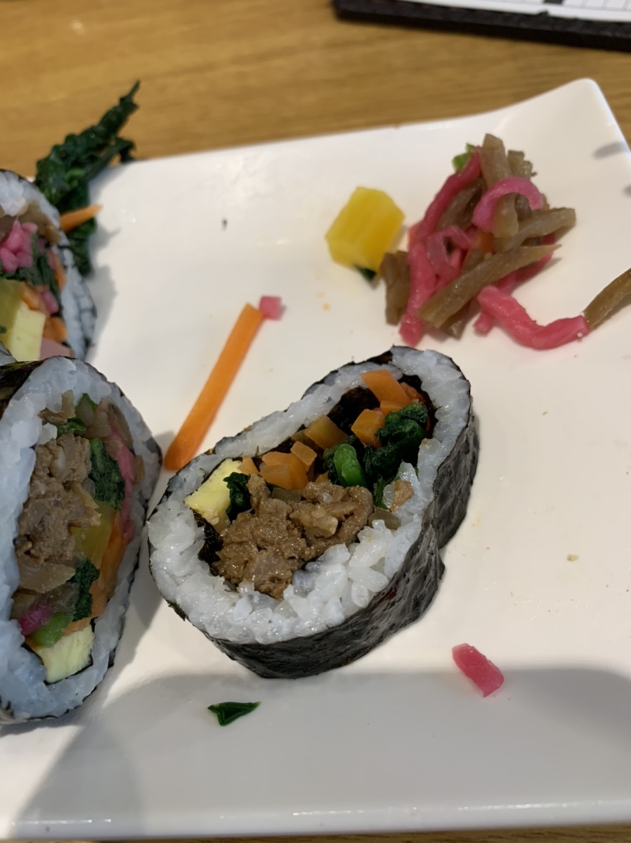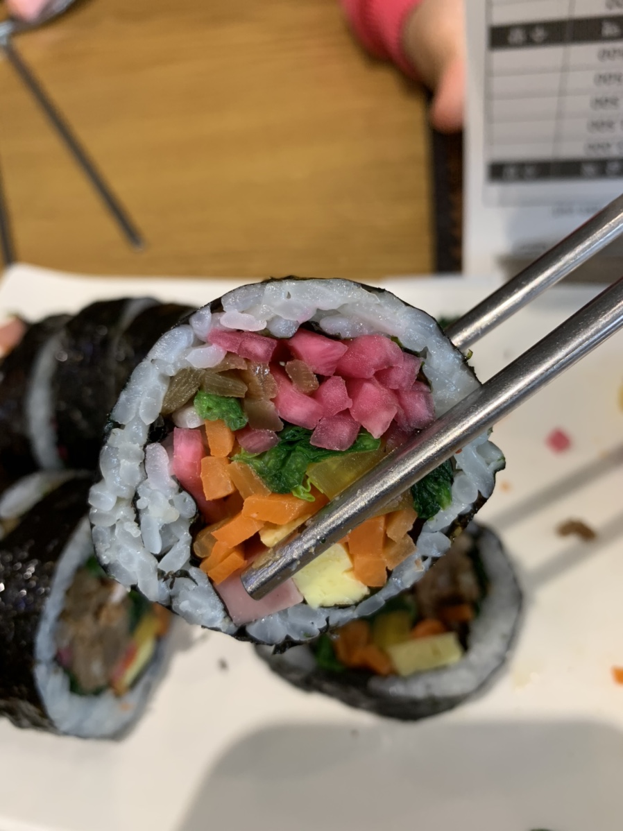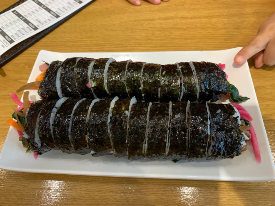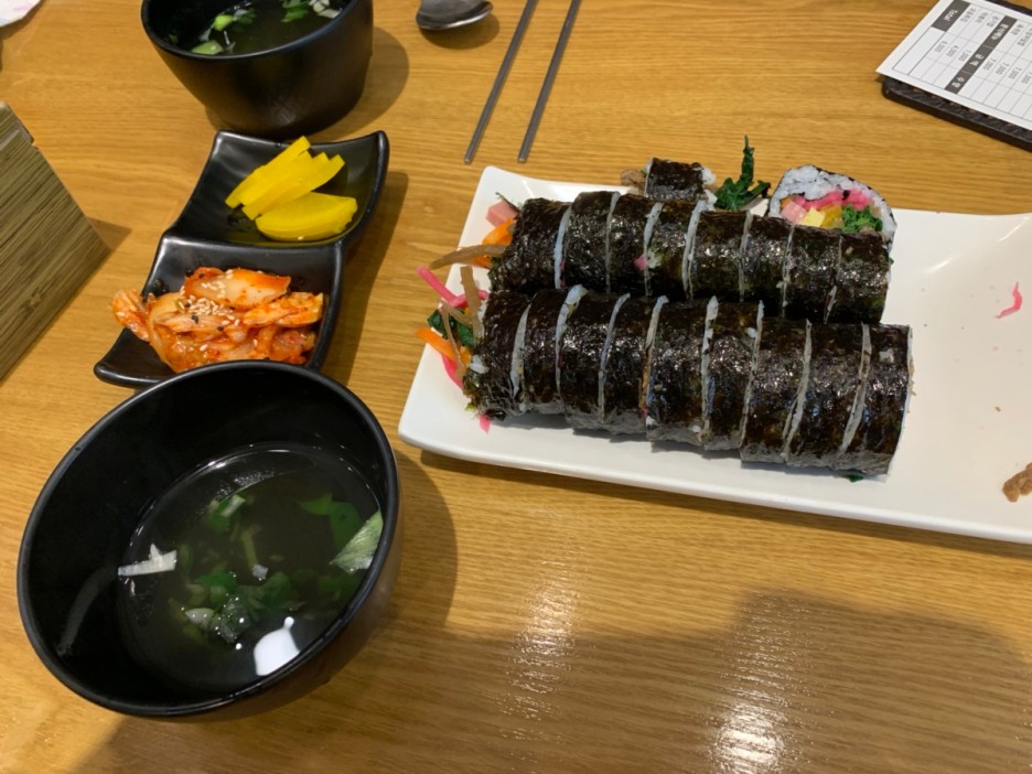 레스토랑에서 나오는 무 피클(채 썬 무에 피클 맛이 있음)이 들어간 특색 있는 김밥 집입니다. 아이는 무 피클이 들어간 김밥은 못 먹을 정도입니다. 그 무를 제외하고는 잘 먹었네요. 제가 먹기에는 맛이 있었는데... 무 피클이 향이 좀 강한 편이라 호불호가 갈리는 김밥이긴 합니다.