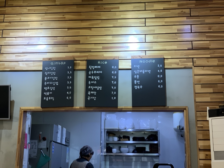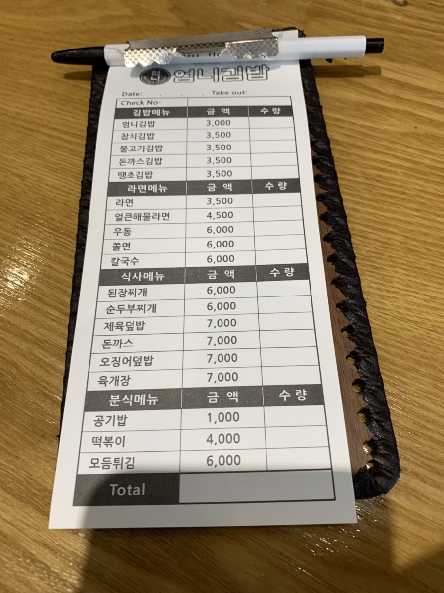 식당에 방문해서 메뉴판을 보니 김밥류, 밥 종류, 면 종류 3가지로 메뉴판이 구성되어 있었고, 다른 테이블은 무엇은 주문했는지 보니 튀김, 떡볶이, 라면 등 메뉴가 다양하게 주문을 하더군요. 첫 방문이고 해서 가장 기본적인 엄니 김밥 3,000원, 불고기 김밥 3,500원 하나씩 주문해 보았네요. 일반적?으로 김밥 집의 기본 김밥과 내용물이 다른(참치, 불고기, 돈가스, 땡고추 등) 김밥과 가격차이가 나는 편인데... 여기는 기본 김밥과 내용물이 다른 김밥과 가격 차이가 크게 나지는 않더군요. 기본 김밥이 3,000원이니^^
