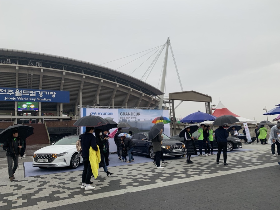 많은 비와 우승이 희박하다는 생각에서 인지!! 평소보다 사람들이 그렇게 많지는 않았습니다. 경기장 입구에는 신형민 선수와 최철순 선수가 신형 그렌저 포토존 앞에서 팬들과 포토타임을 가지고 있었습니다. 아이와 함께 경기장에 방문했으면 포토타임을 갖는 건데, 아이는 우천으로 인해 집에서 경기를 보기로 했었네요. 12월 초 비까지 오니 날씨는 무지 쌀쌀했습니다. 경기장에 들어가 N석에서 선수들 몸 푸는 모습을 잠시 구경하다 지정석인 E석으로 가보았네요. 비는 내렸지만 좌석이 1층 20열로 바람만 불리 않으면 2층 캐노피로 인해 비는 피할 수 있는 자리라서 관람하기 좋았네요. 2020년 시즌권은 1층 맨 마지막 열을 구매하려 했으나, 이미 매진이라 21열을 구매했네요.(시즌권은 언제 오지?)