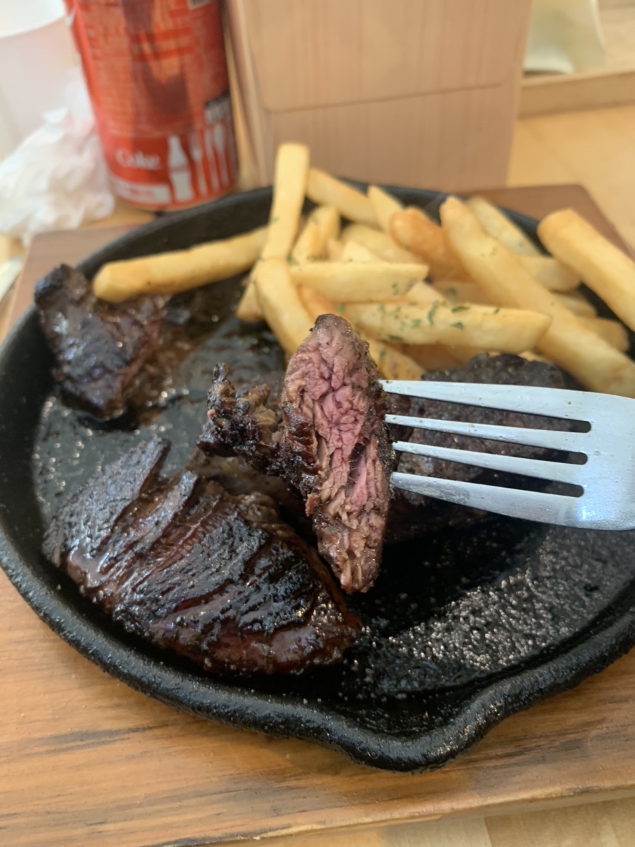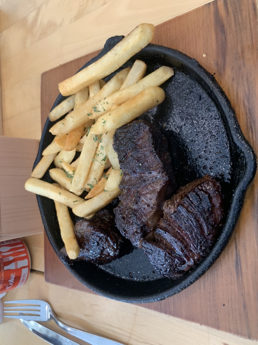 주문한 스테이크가 나왔네요. 스테이크는 약 200g으로 한 끼 식사로는 양이 적은 느낌이 들었네요. 사이드로 감자튀김 맛있기는 하나 한 끼 식사로는 약간 부족한 느낌이 들었네요. 스테이크는 고깃결에 따라 잘라서 먹어야 하는데, 고기를 자른다는 느낌보다는 결에 따라 고기를 뜯어서 먹을 수 있을 정도로 부드러웠습니다. 저녁 식사로 만 원으로 스테이크를 먹기에는 가성비 좋은 한 끼 식사 있을 수 있겠지만, 점심 식사로는 약간 부족한 느낌이 들었습니다.