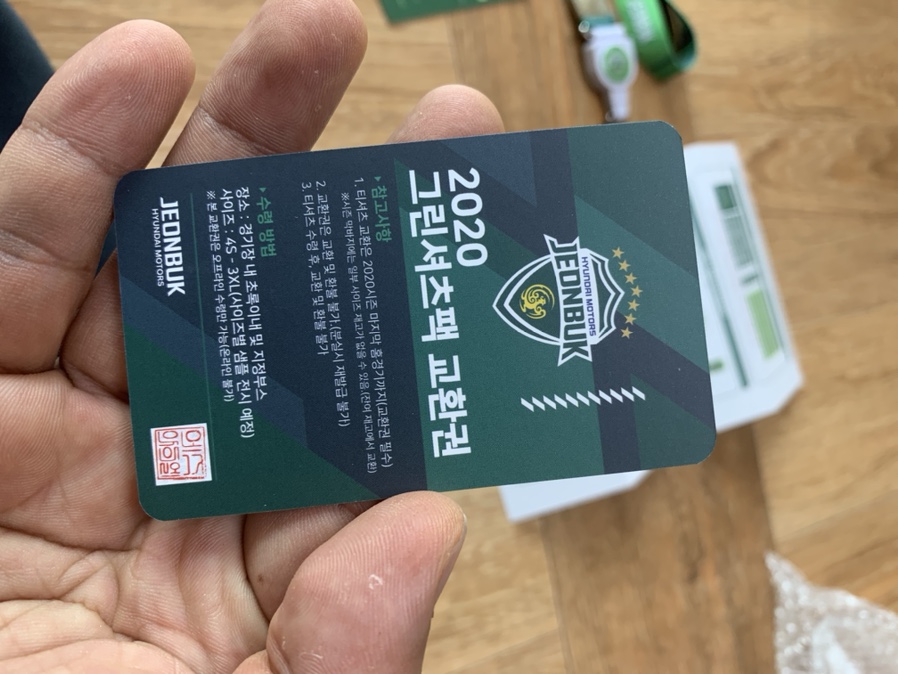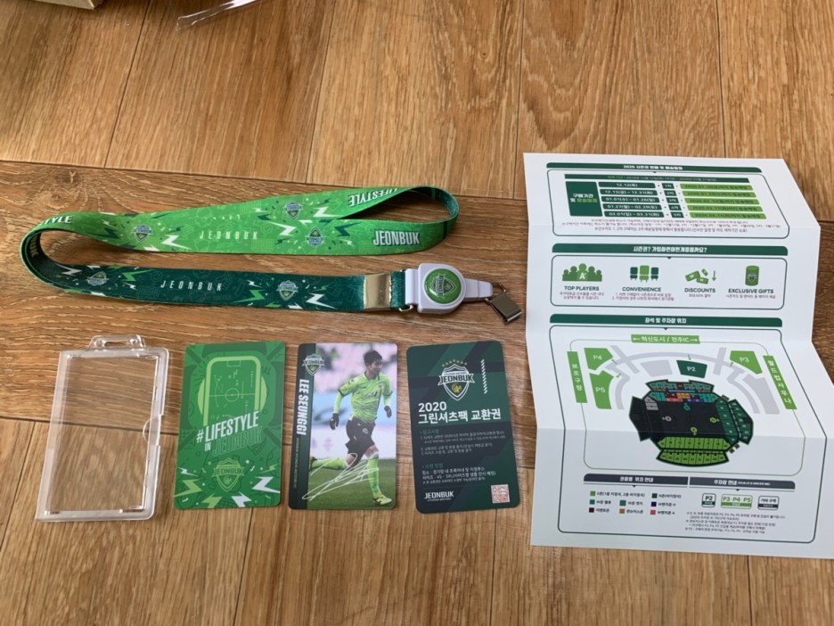 `18~19년 시즌권은 김진수 선수로 신청하였으나 올해는 이승기 선수로 신청했습니다. 작년 좋은 활약을 보여주었고, 올 시즌 더 좋은 활약이 기대되는 선수이기에 선수카드를 골랐네요. 아이가 김신욱 선수를 좋아하는데, 김신욱 선수는 중국으로 이적하고 그다음으로 좋아하는 선수가 이승기 선수라고 해서 선정해 보았네요. 올해 시즌권을 펼쳐서 사진을 찍으려고 보니 약간 이상한 부분이 있더군요. 티켓이 2장이면 목줄을 2개 보내주어야 하는데 목줄이 하나만 왔네요. 그나마 다행히 그린 셔츠 팩 교환권은 잊지 않고 넣어 주셨네요.