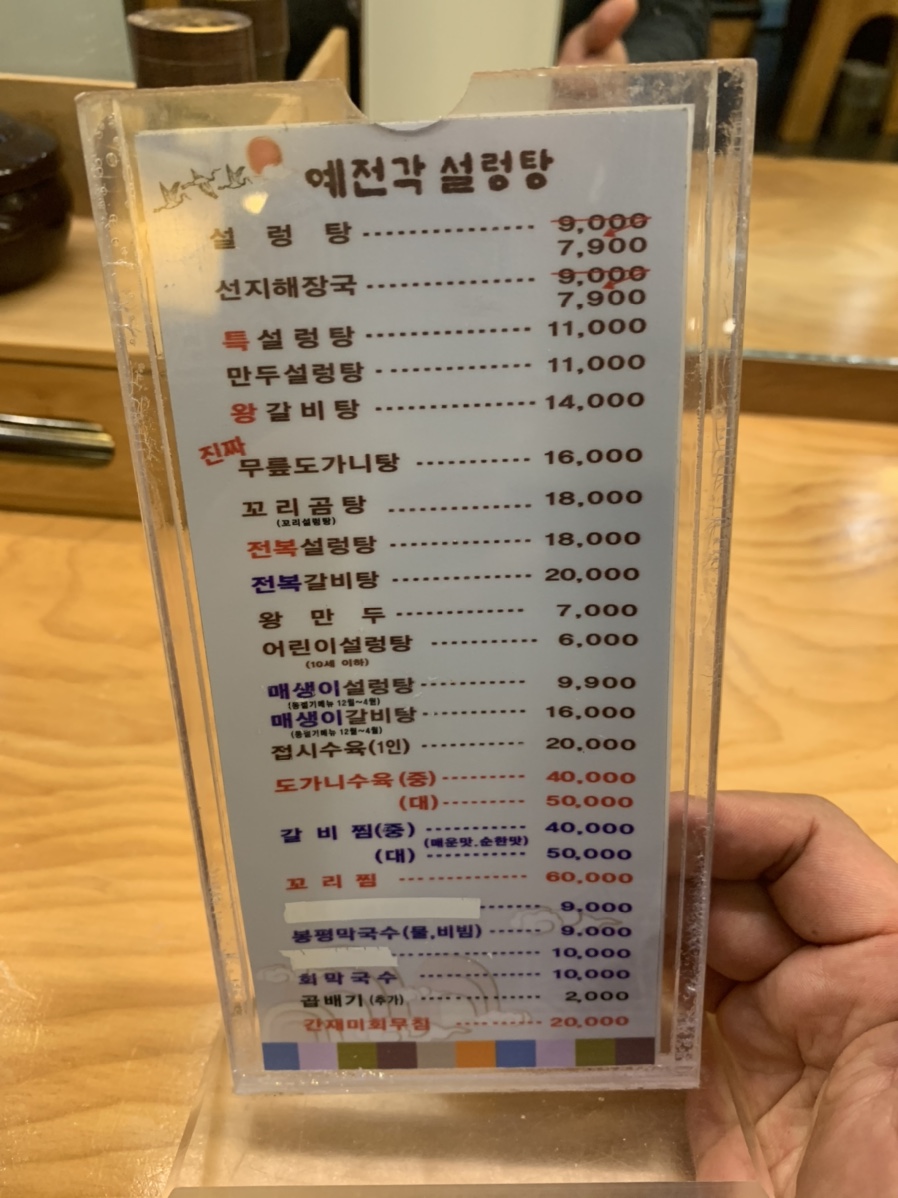 식당에 들어서니 혼밥은 식탁으로 안내를 해주시네요. 혼밥하는 손님들이 많아서 그런지 혼밥용 식탁이 별도로 준비가 되어 있었습니다. 메뉴판을 보고서 7,900원 설렁탕 한 그릇 주문해 보았습니다. 설렁탕 전문점이라 설렁탕과 수육이 주메뉴라고 생각했었는데, 다양한 메뉴가 보여서 전문점이라는 생각이 느껴지지는 않더군요.