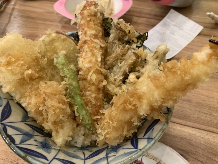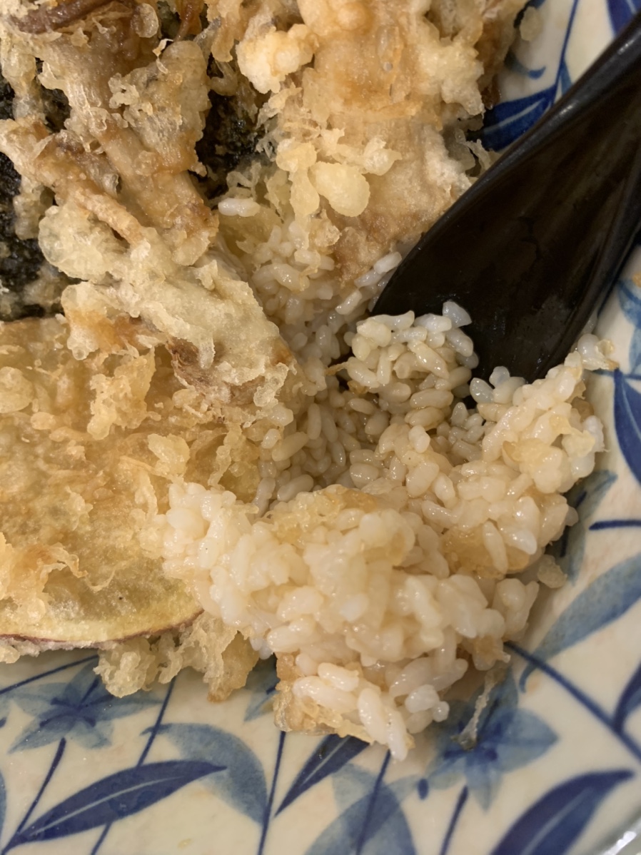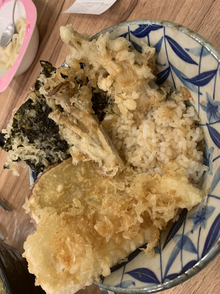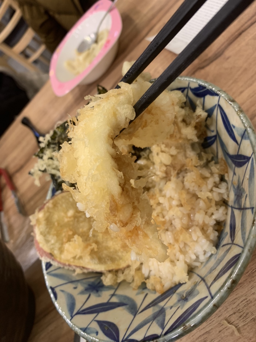 우동은 그런대로 먹을만했었는데, 텐동은 튀김이 바삭할 거라 생각했었는데 너무 눅눅하더군요. 새우는 신선하고 맛은 좋은데 이렇게 맛있는 새우를 뒤덮은 튀김옷이 너무 눅눅해서 어울리지는 않더군요. 텐동 바닥에 깔려있는 밥이 구슬 밥처럼 텐동 간장소스와 잘 어울려야 하는데 맛이 약간 죽 밥이라 아쉬움이 많이 남는 음식이었네요. 텐동의 튀김은 고구마/버섯/새우/어묵/고추 튀김이 들어있는데 튀김 중 그나마 먹을만했던 튀김은 고구마튀김이었네요.