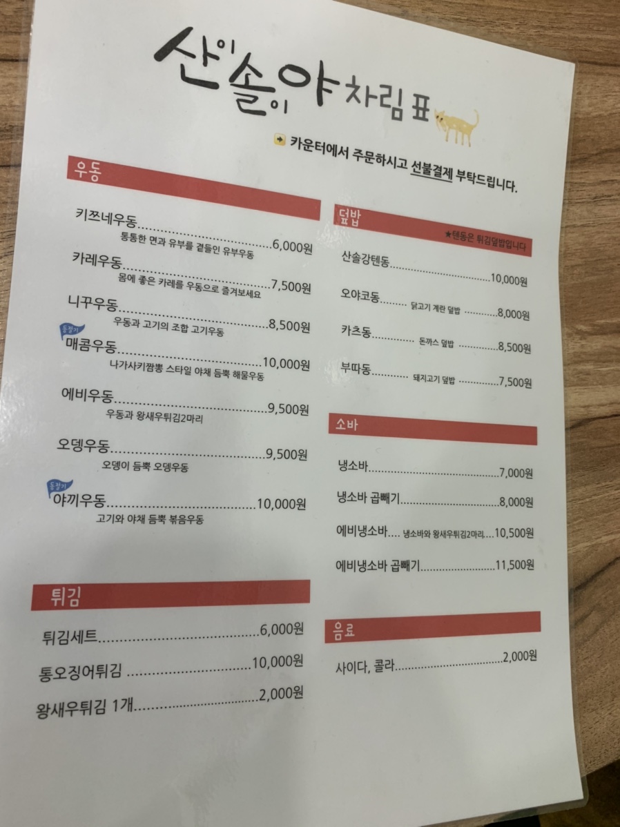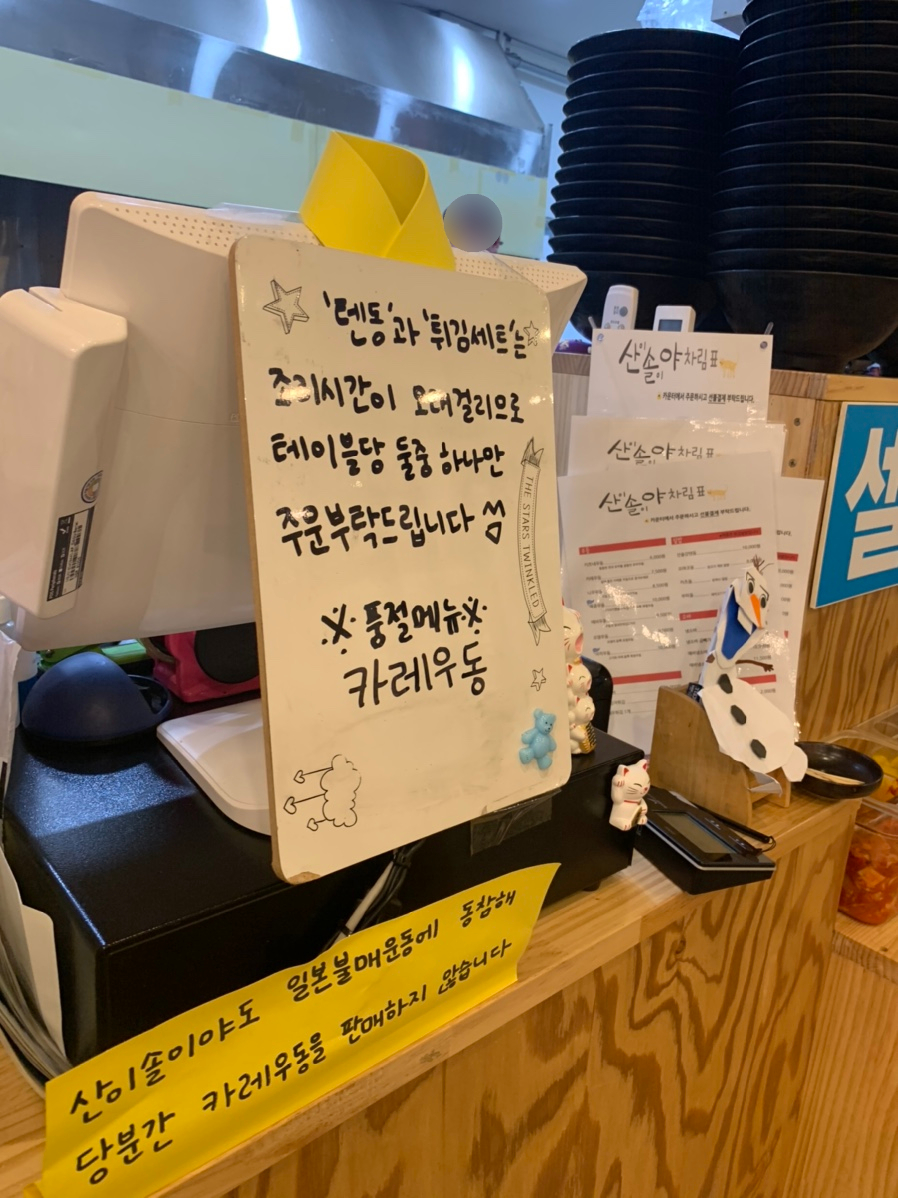 한적한 주택가에 위치한 식당으로 손님이 많이 없을 거라 생각했었는데, 그래도 손님이 꽤 보이더군요. 메뉴는 우동, 튀김, 덮밥, 소바로 구성되어 있으며 다른 손님들은 튀김을 주로 주문하시더군요. 우선 아이가 좋아하는 우동 6,000원 하나와 텐동 10,000원 하나씩 주문했습니다. 주문하는 포스기에는 텐동과 튀김은 조리시간이 오래 걸려서 하나씩만 주문을 받는다는 문구가 보이더군요.