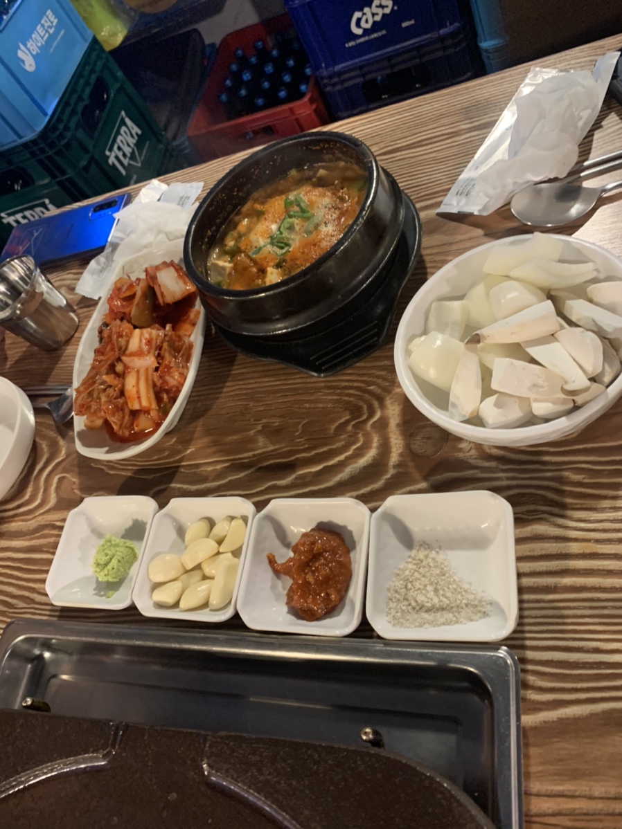 주메뉴는 오겹살과 목살로 1인분에 14,000원으로 오겹살 2인분 목살 2인분씩 주문했습니다. 메뉴를 주문하고 불판 위에 젓갈을 올려주시고 기본 반찬으로 된장찌개, 김치, 파절이를 세팅해 주시네요. 고기와 술 마시려면 기본 국물이 나와야 맛있게 먹을 수 있는데, 기본으로 된장찌개가 나와서 좋았네요. 요즘 고깃집에 안 나오는 식당들이 많이 있어서.... 기본으로 국물은 세팅으로 나오는 식당이 많이 있었으면 좋겠네요.