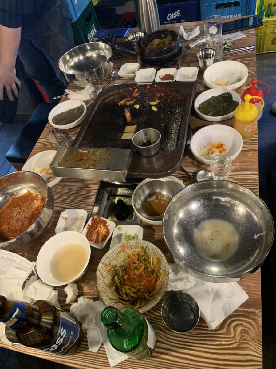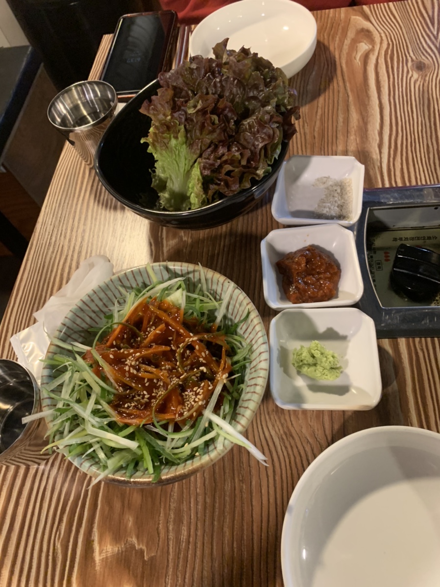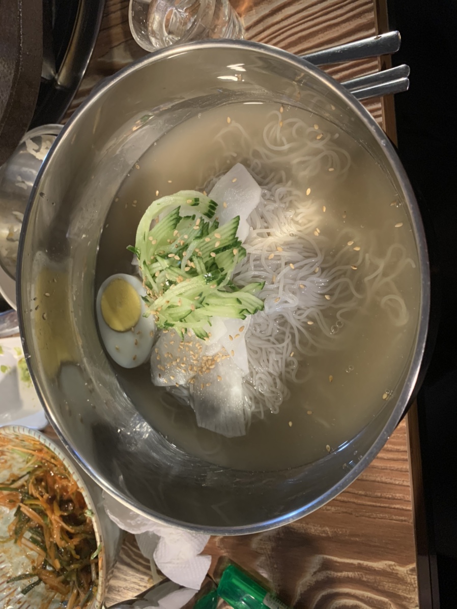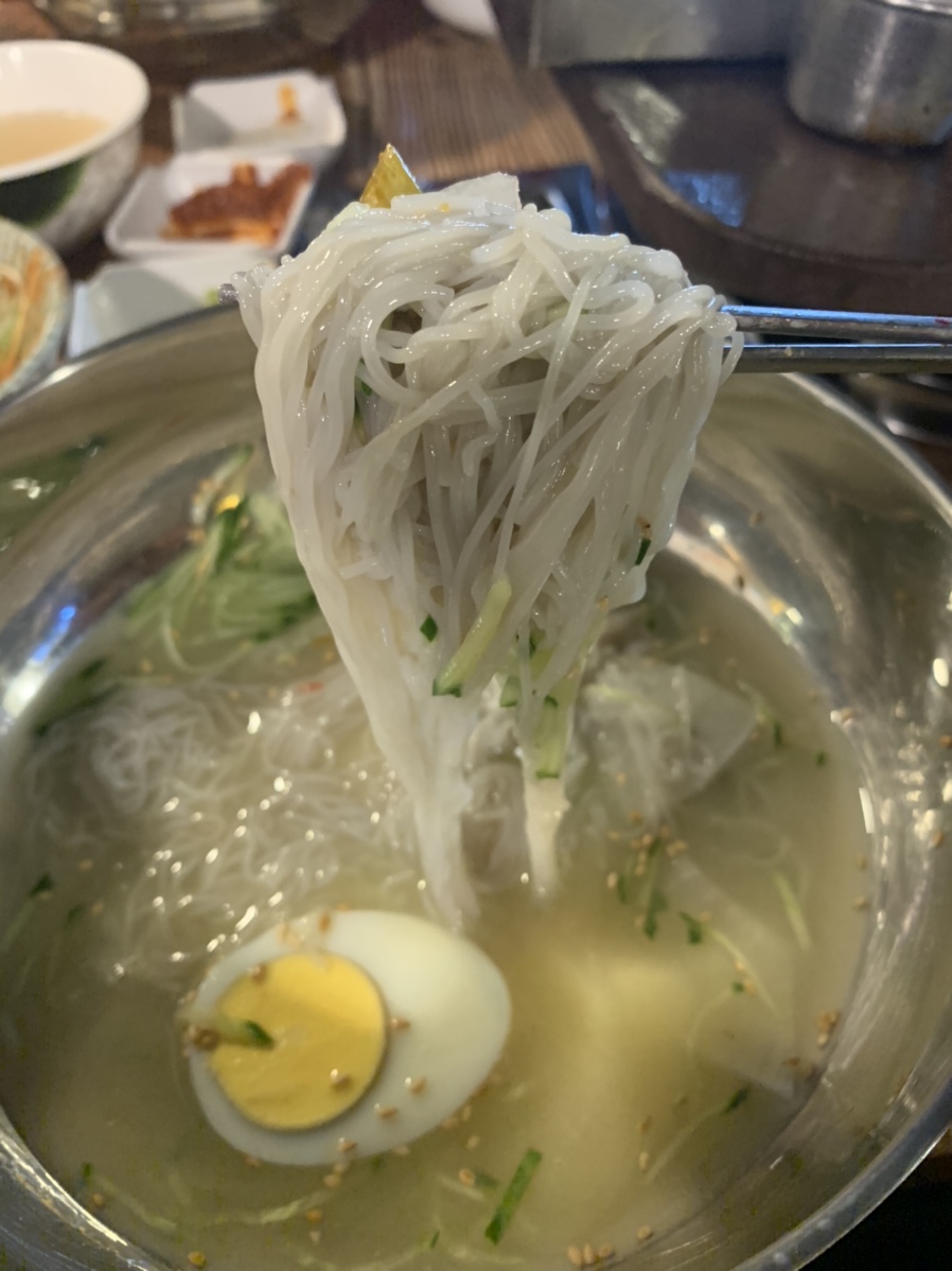 고기는 젓갈에 찍어 먹어도 좋지만, 여기는 겨자와 함께 먹는 게 맛이 더 좋더군요. 고기의 느끼함을 겨자가 잡아줘서 느끼한 고기도 상큼하게 먹을 수 있더군요. 목살은 약간 퍽퍽한 느낌이 있어서 고기는 오겹살이 더 맛이 좋더군요. 고기를 맛있게 먹고 후식으로 냉면을 주문해 보았네요. 볶은밥을 주문하려 했으나, 고기를 많이 먹어서 그런지 약간의 느끼함이 올라와 냉면을 주문했네요. 냉면은 일반적으로 먹는 후식 냉면이라 기본은 하더군요.