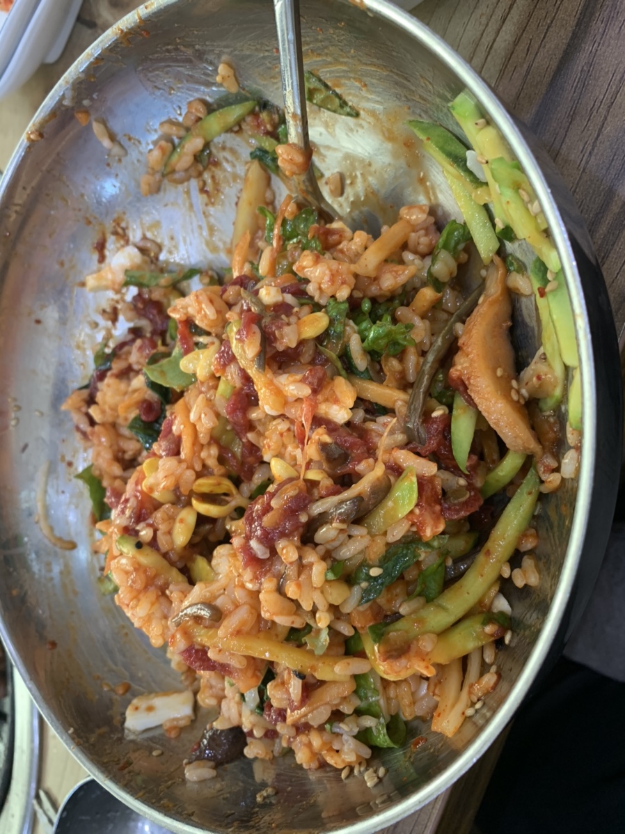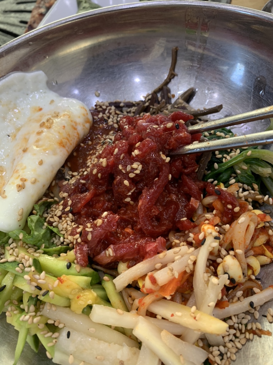 갈비는 처음에 나온 갈비는 맛있게 먹었는데, 추가로 주문한 갈비는 처음 먹었던 갈비 맛은 아니더군요. 약간 퍽퍽한 느낌이 좀 들더군요. 고기가 퍽퍽해서 그런 느낌이 들었을 수도 있고, 고기와 함께 먹을 국물이 없어서 퍽퍽함을 느꼈을 수도 있고.... 고기는 추가 없이 1인에 1인분 먹고 후식을 먹는데 어느 고깃집이나 정석 같습니다. 보통 고기를 먹으면 냉면으로 후식을 주문하는데, 냉면은 어느 식당이나 동일하여 육회비빔밥을 주문해 보았습니다. 육회비빔밥은 어느 식당이니 기본 맛은 하여 맛 표현은 페스!