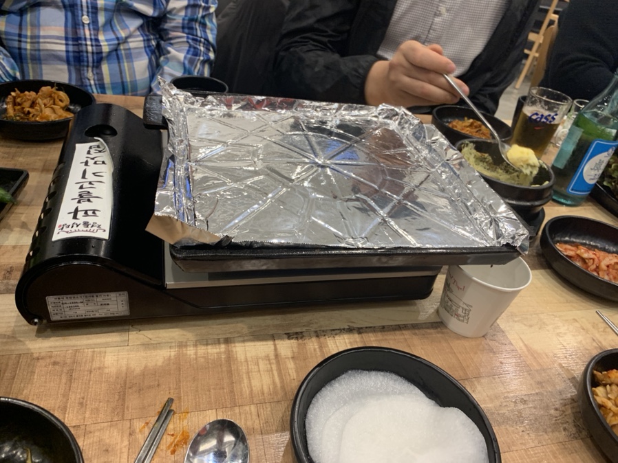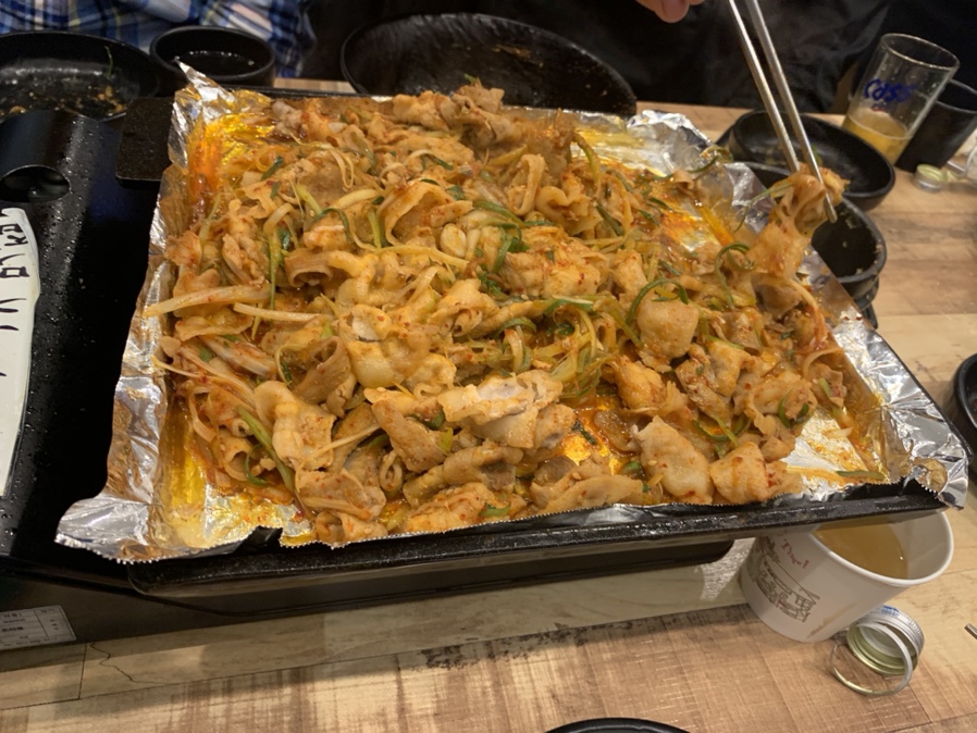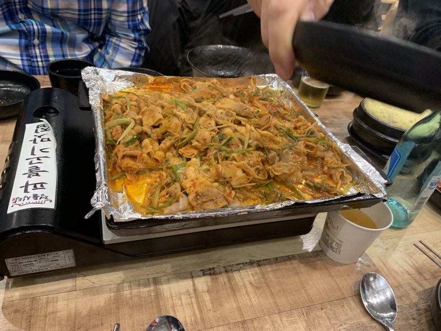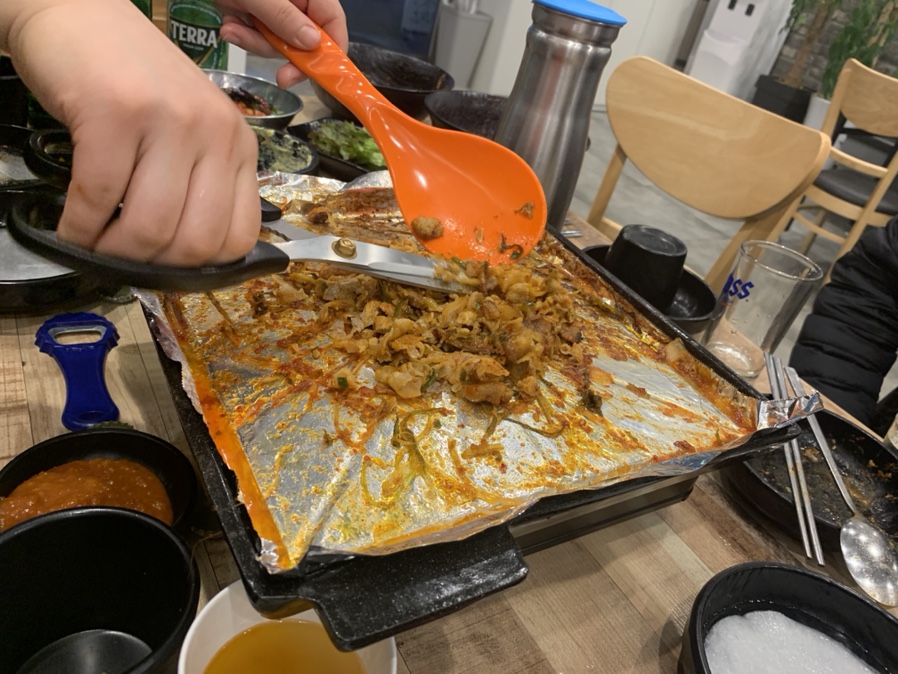 집 밥 백 선생에서는 대패 두루치기로 소개되었는데, 식당에서는 고추장 파 불고기로 1인분 7,900원에 판매되고 있습니다. 음식을 주문하면 먼저 대패삼겹살을 불판에 구워주시더군요. 이 불판은 대패삼겹살이 약 15년 전쯤 유행했을 그 당시 불판과 유사하더군요. 은박지에 대패삼겹살을 구워서 고기를 기본으로 먹고, 파채를 함께 볶아 먹다가 마무리로 볶은밥을 볶아 은박지를 감싸고 그릇을 올려주는 마무리? 가 생각나더군요.
