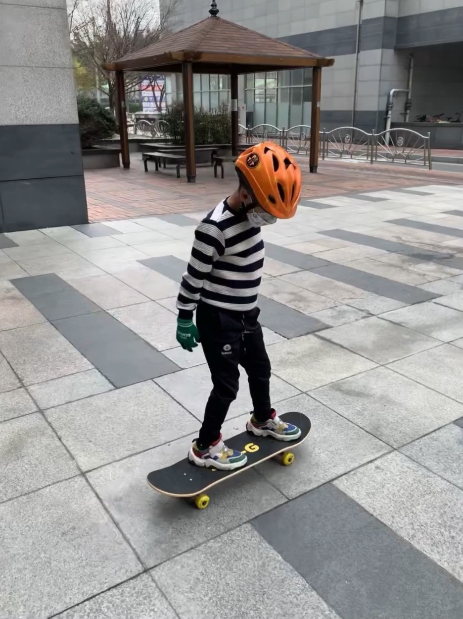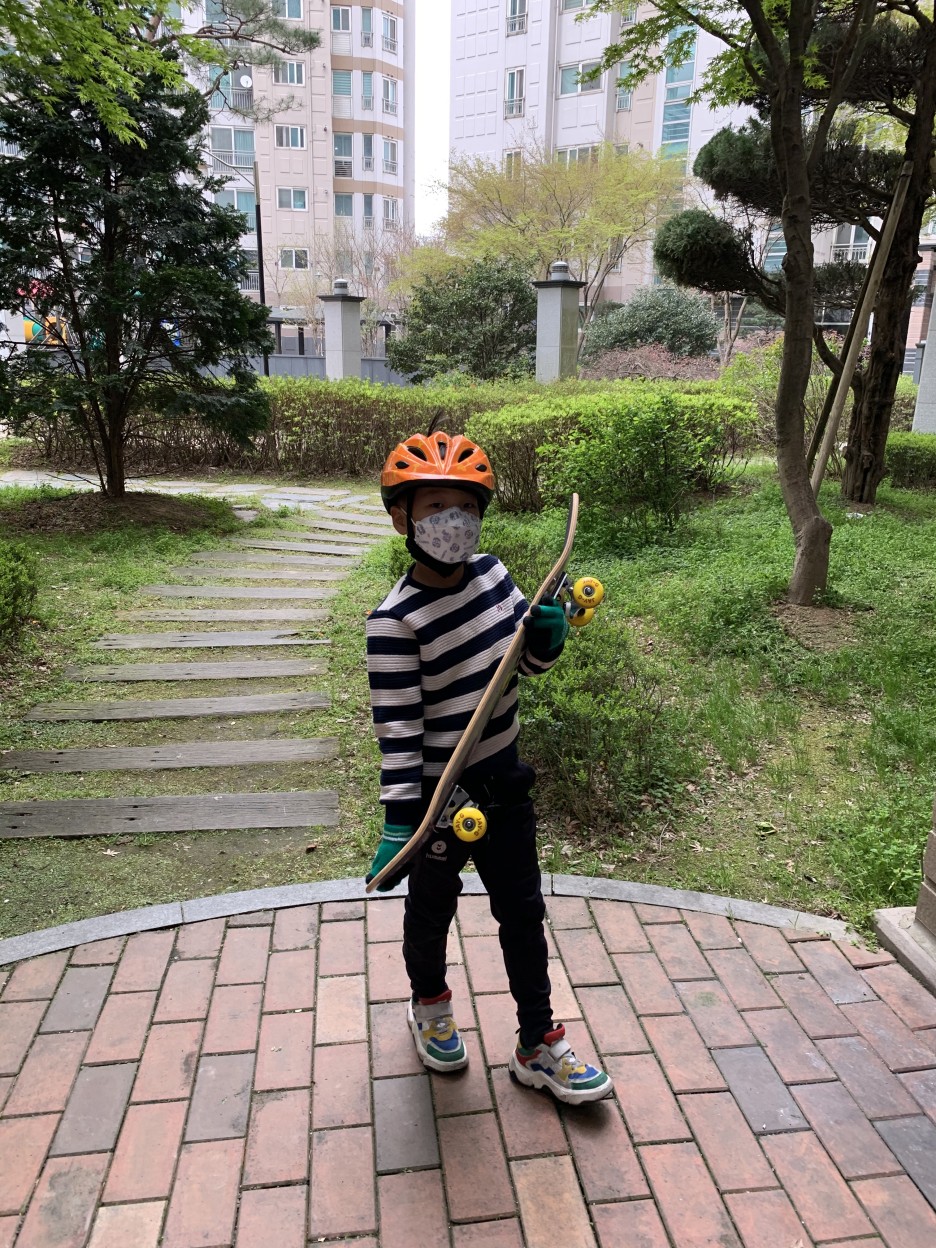 스케이트보드는 균형을 잃으면 한 번에 꽈당하는 스포츠?이다 보니 자전거 안전모를 씌우고 아파트 앞으로 나가보았습니다. 스케이트보드 자세 잡는 방법과 푸시 오프를 알려주니, 처음 타는 것치고는 균형을 잘 잡고 타는군요. 어려서 잘 못 탈 거라 생각했었는데,,,,, 어려서 잘 타는군요. 푸시 오프 다음 단계인 틱택을 알려주었는데.... 여러 번 꽈당하면서도 무서워하지 않고 어설프게라도 폼을 잡는군요.ㅎㅎ 한 달 정도만 알려주면 틱택은 자유롭게 탈 수 있겠더군요.