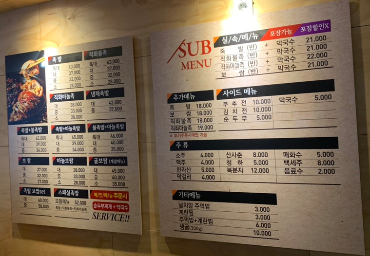 여느 족발 프랜차이즈 족발과 비슷한 맛과 가격입니다. 마늘 족발에 들어간 마늘향이 느껴지지 않아서... 마늘의 특유 향이 살아있고, 보쌈이나 족발이 느끼한 음식이다 보니 곁들여 먹을 수 있는 밑반찬이 있으면 좋겠더군요.