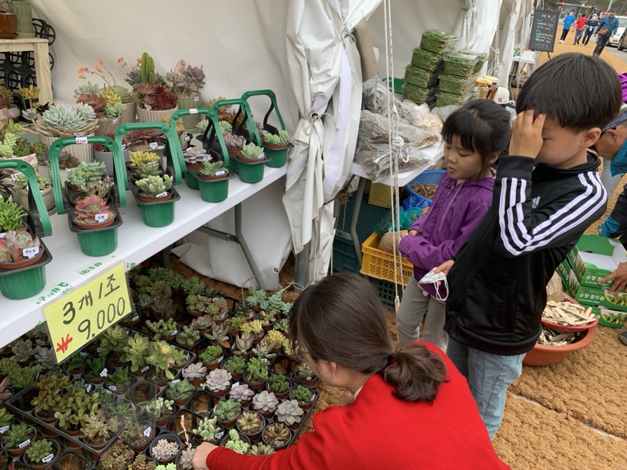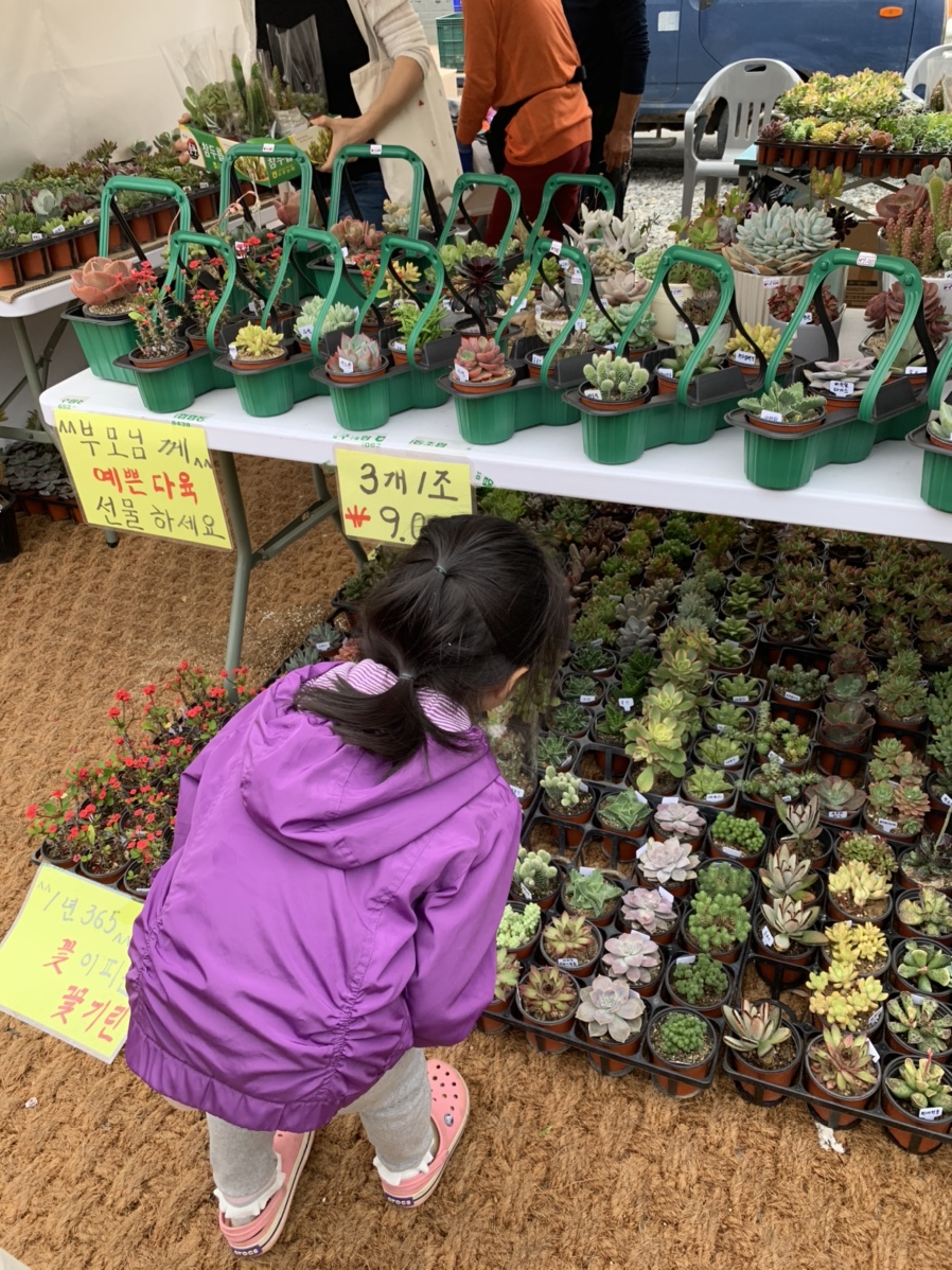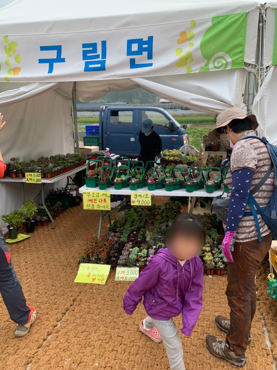 두릅전을 아이들인 안 먹을 거라 생각하고 컵라면을 주문했는데, 아이들은 컵라면은 안 먹고 느릅 전이 맛있다며 잘 먹었네요. 내가 막걸리와 함께 먹으려던 두릅전은 아이들에게 넘어가고, 남은 컵라면만 먹게 되었네요.ㅠㅠ 순식간에 해치운 두릅전을 뒤로하고 구림면에서 다육 판매 부스로 향했습니다. 아이들이 다육을 보고서 마음에 드는 거 하나씩 총 2개를 5,000원에 구입했네요.ㅎㅎ