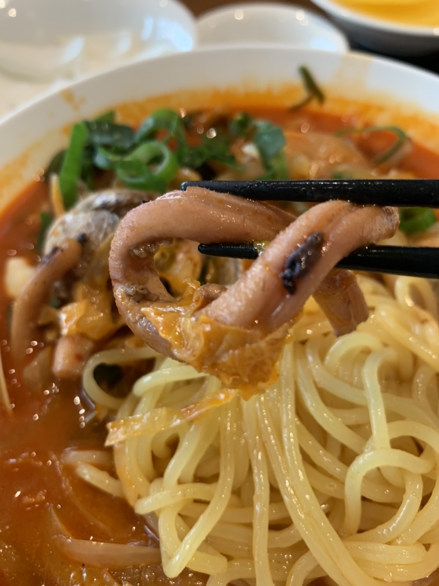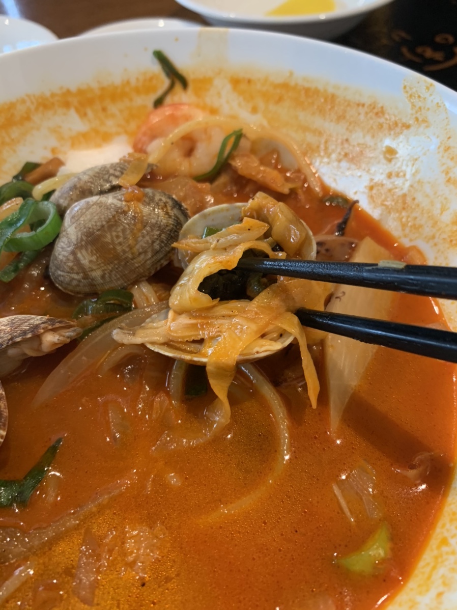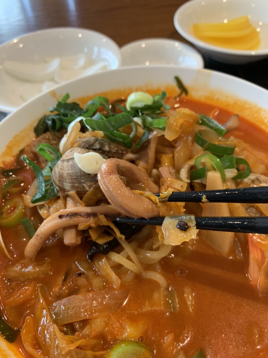 가볍게 저녁식사를 위해 방문한 상하이 반점! 짬뽕을 주문하고 공깃밥을 추가했으나.... 기본으로 반공 깃 밥이 나온다길래 추가 주문하지는 않았습니다. 가격대는 7,500원으로 무난한 가격대로 홀에 대부분의 손님들은 짬뽕보다는 볶음 짜장을 많이 주문하시더군요. 오늘은 짬뽕을 먹기 위해 방문했으니 짬뽕에 집중?! 짬뽕 국물은 바로 조리한 짬뽕의 국물이라기보다는 육수를 오랫동안 끓인 걸쭉한 국물입니다. 새우는 탱글탱글한데, 오징어는 좀 오래 끓여서 그런지 색갈이 변했네요.