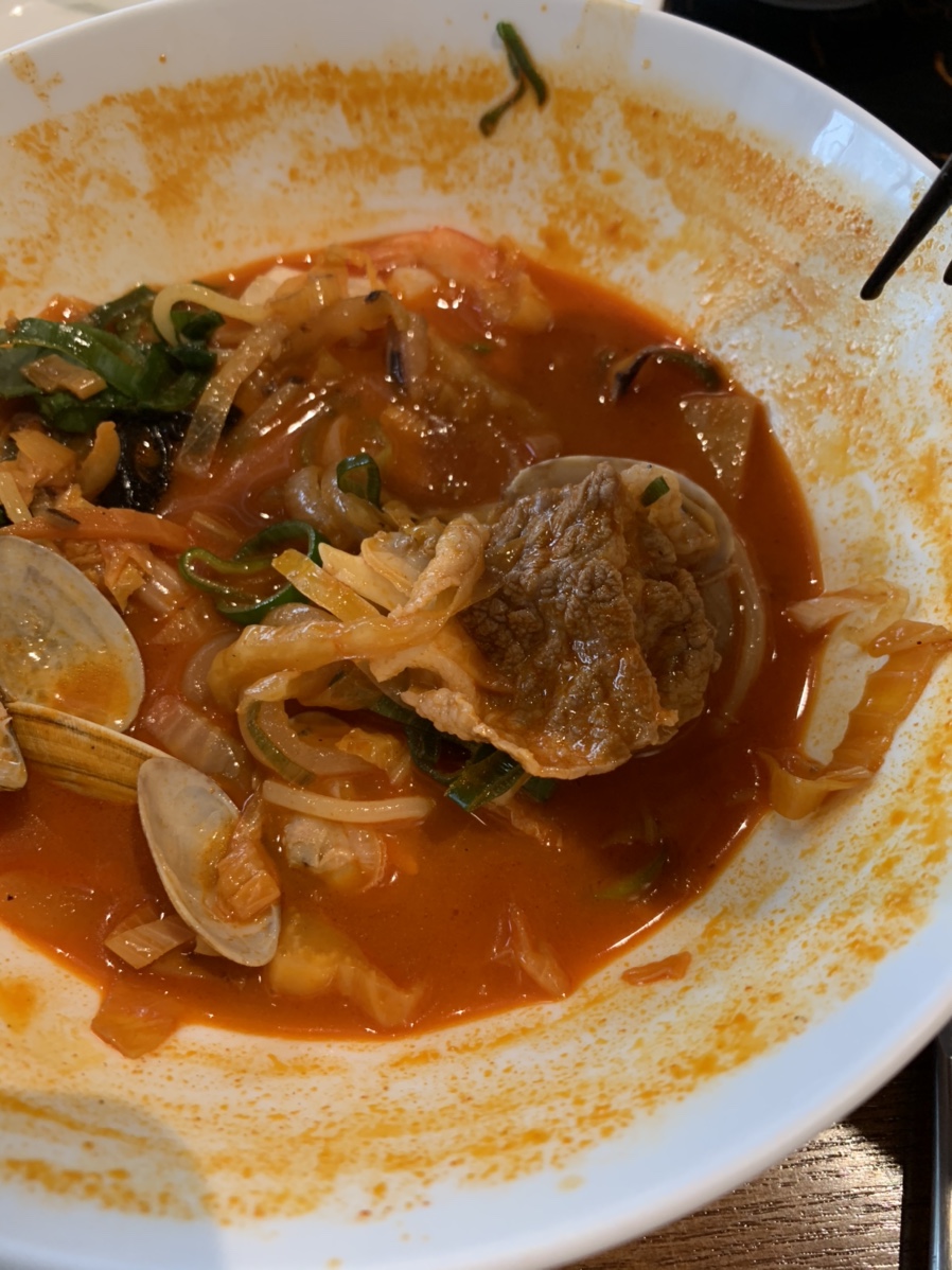 짬뽕 양이 적어서 그런지 함께 나오는 반공 깃 밥을 국물에 말아서 먹기에는 좋더군요. 국물이 진한 사골국 느낌으로 짬뽕면보다는 짬뽕밥이 더 어울리겠더군요. 이렇게 진한 국물이 나오는 짬뽕이 교동 짬뽕과 유사한 스타일인데, 교통 짬뽕은 너무 사골국 느낌이 강해서^^ 상하이 반점 짬뽕은 교통 짬뽕과 일반 짬뽕(맑은 국물)의 중간 정도의 국물 농도이네요. 짬뽕을 거의 다 먹고 밥을 말려고 그릇 바닥을 끊으니, 차돌박이가 하나 나오네요. 짬뽕이 오징어, 조개, 새우, 차돌박이.... 짬뽕이네요.