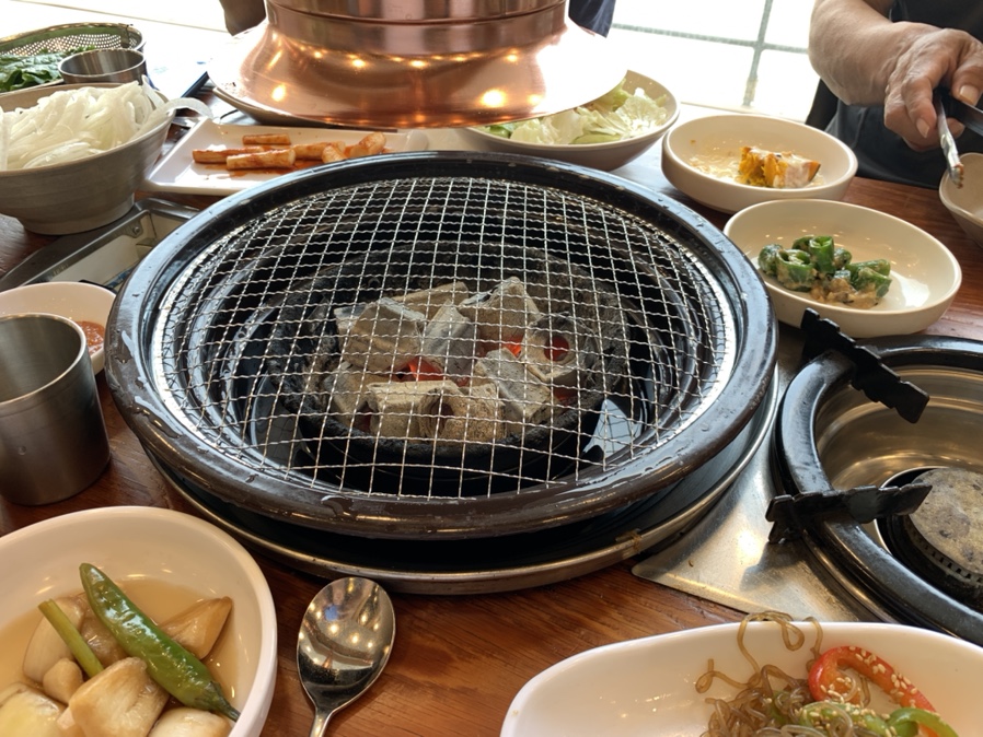 내부에 손님도 많이 안 보이는데..... 고기 연기가 식당 내부에 가득 차서, 순간 화생방 훈련하는 줄 알았네요. 갈비는 자주 뒤집어 주어야 타지를 않는데...... 고기는 간단히 인당 1인분씩 먹고서 고기 추가보다는 국물이 당겨서 얼큰 갈비 샤브 전골을 주문해 보았습니다. 후식으로 김치찌개가 있으면 참 좋겠는데.... 아니면 얼큰 라면이나! 아쉬움이 남음....