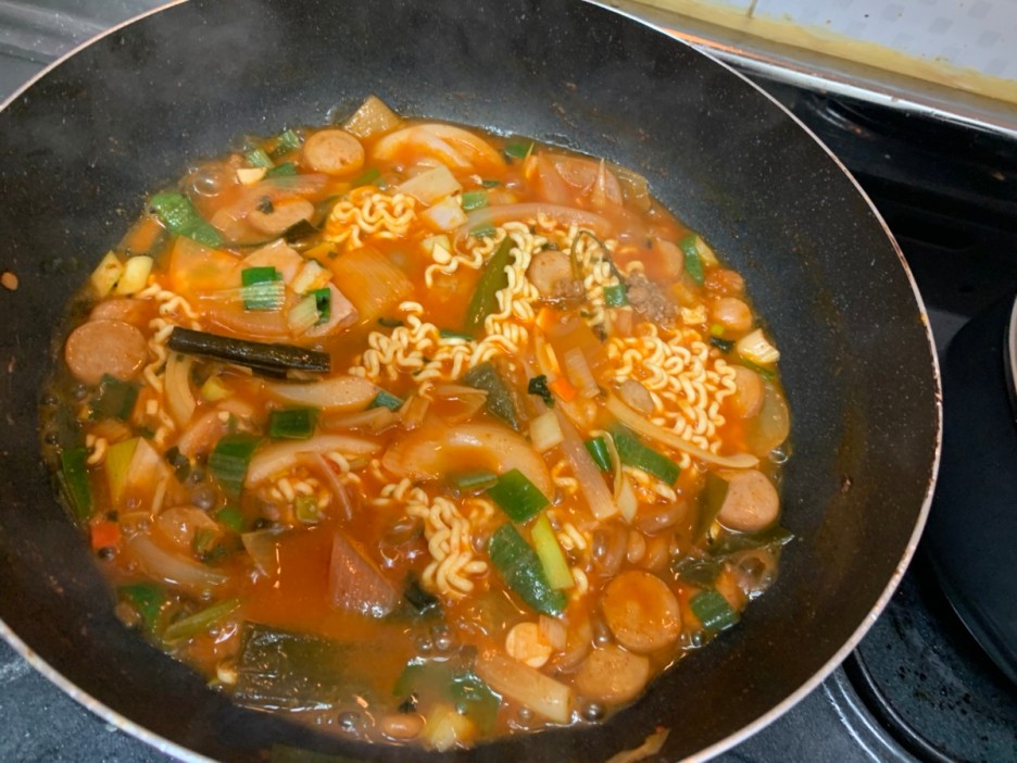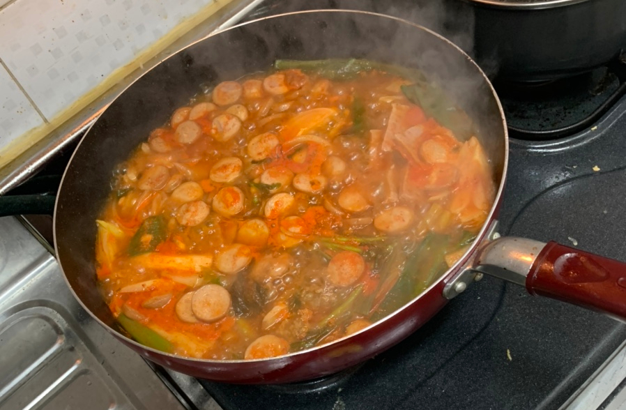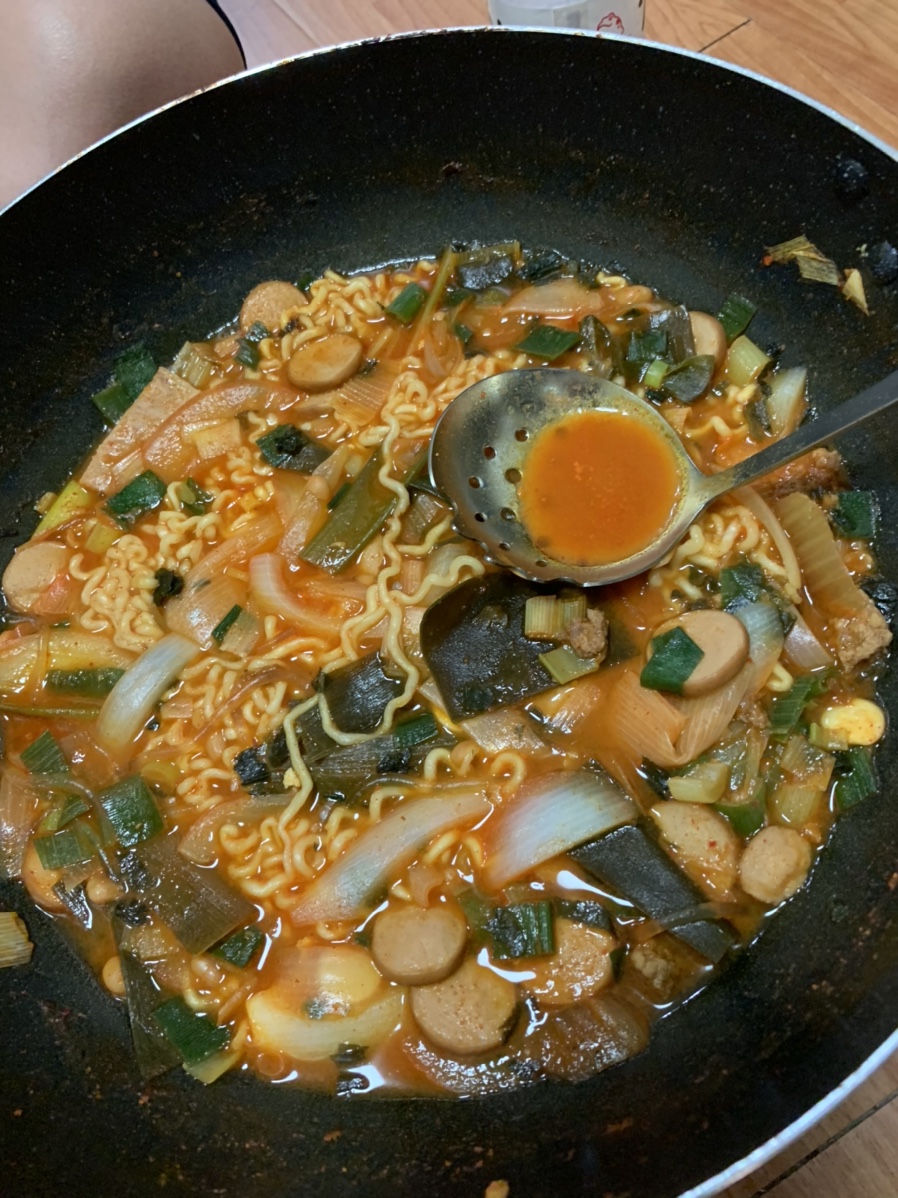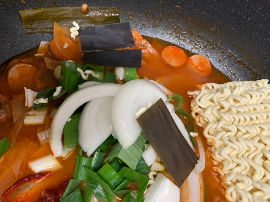 부대찌개는 대충 끓여도 맛있는데.... 양념장에 더 맛있게 먹으려면 소스를 만들어 넣어주면 더 맛나겠죠. 저는 부대찌개 소스 비율은 고춧가루 4 간장 1, 마늘 1, 굴 소스 2, 다시다/치킨스톡 0.5 그리고 굴 소스 1.5 정도를 넣어서 만들어 줍니다. 부대찌개를 어느 정도 먹고 난 후~ 부대찌개에 빠질 수 없는 라면을 넣어 보았습니다.