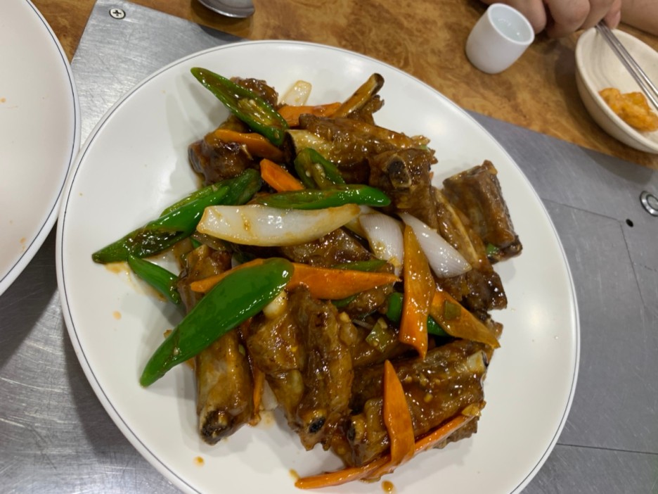 음식과 식당 분위기가 중국식이니 술도 중식 분위기에 맞추어 공부가주를 주문해 보았습니다.^^ 탕수육은 무난한 편으로 얇은 고기를 감자 전분에 쫄깃하게 튀겨 나오더군요. 탕수육 겉에 소스가 살짝 붙여져서 겉바속촉의 식감이 괜찮았네요. 탕수육과 함께 주문한 홍소 갈비!!! 이 홍소 갈비가 맛이 정말 괜찮았습니다. 매콤한 갈비찜 느낌도 나고, 먹으면 먹을수록 당기는 맛이었네요. 술과 딱 맞는 안주였네요.ㅎㅎ
