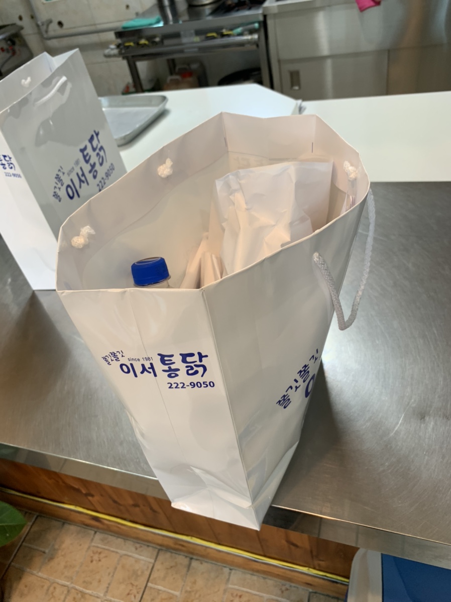 치킨 포장이 주로 박스에 담겨 있는데, 이서 통닭은 넓은 종이에 통닭을 말아서 쇼핑백에 담아주는 스타일이고 양념과 치킨무 그리고 콜라가 들어있습니다. 치킨 포장을 살짝 열어보니, 닭발이 보이네요^^ 쫄깃한 식감의 닭발은 제가 좋아하는 부위라 강추!!!