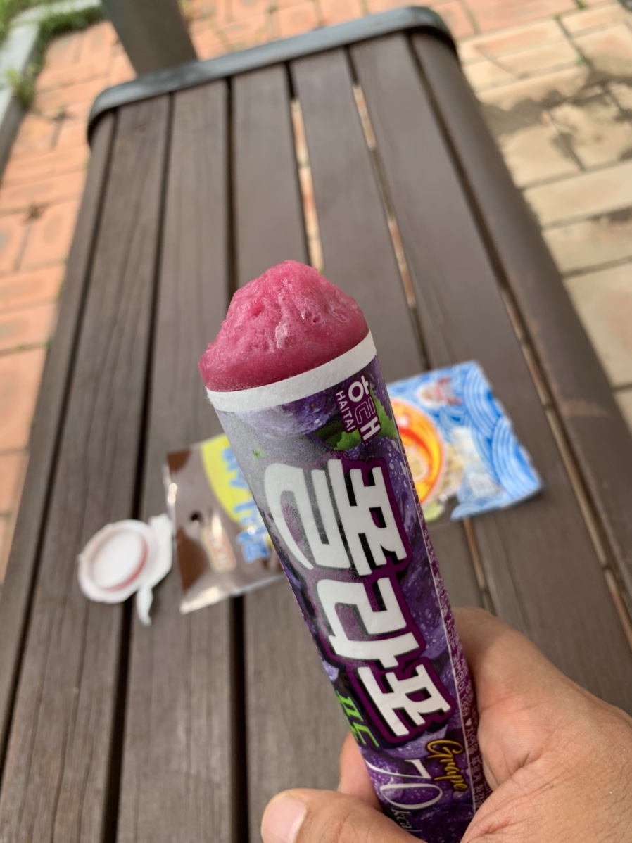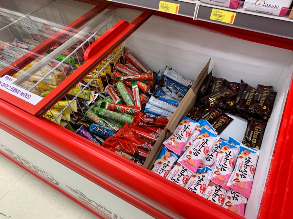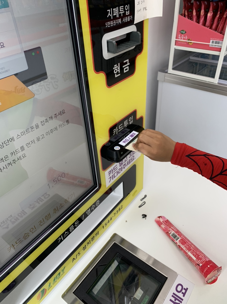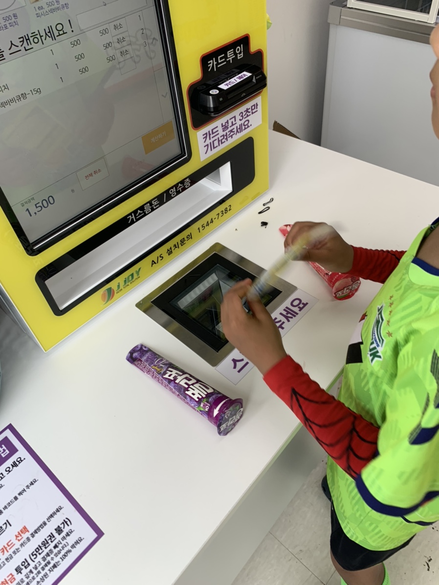 아이스크림과 아이가 좋아하는 쥐포?를 골라서 계산대에서 스캔해 주었네요. 아이스크림 할인점이라 아이스크림과 과자가 비교적 저렴하게 구성되어 있었네요. 편의점에 인력을 줄이고 비교적 저렴한 상품을 판매할 수 있어서 좋은 점도 있겠지만, 편의점 내 라면이나 간단한 식사를 할 테이블이 없다는 게 좀 흠이었네요.