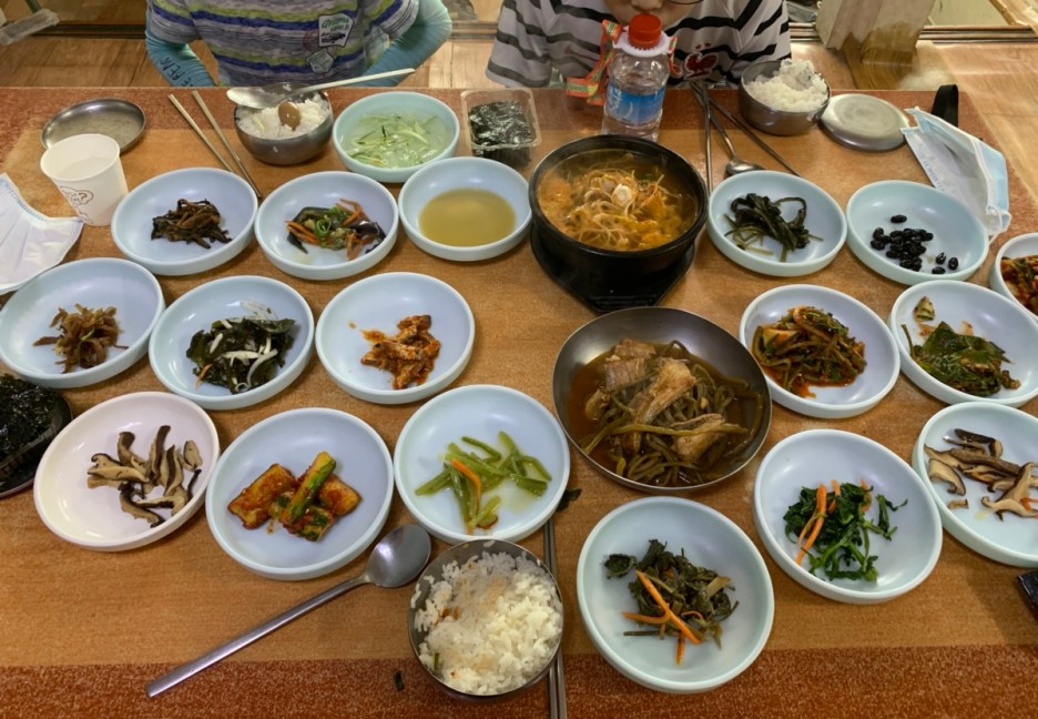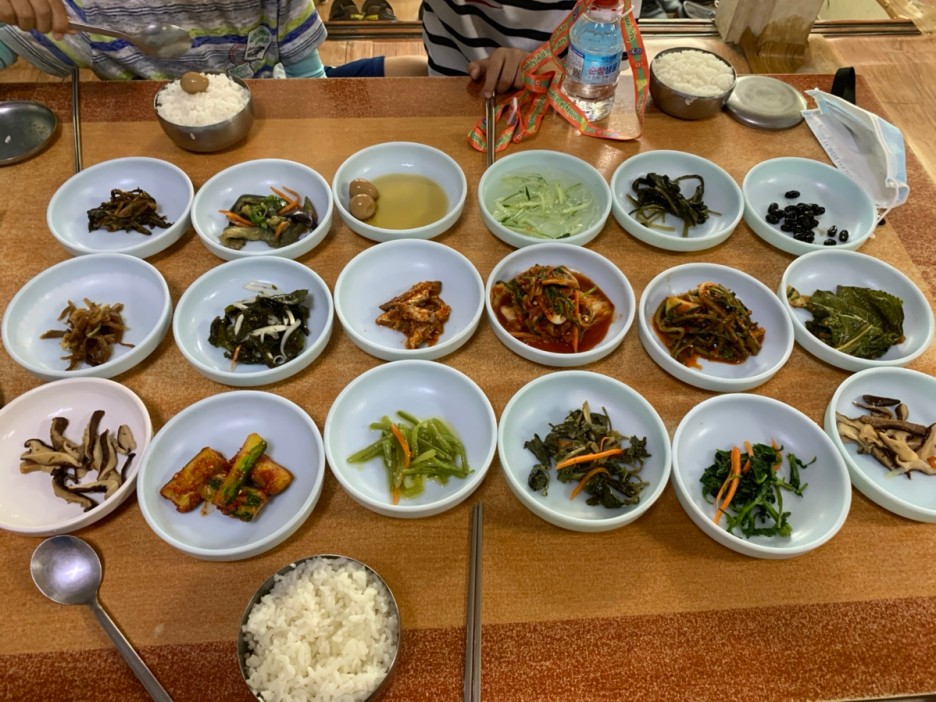 조금 늦은 점심시간에 식당에 방문하였는데, 식당 내부에는 손님들로 가득 차 있더군요. 메뉴판에는 다양한 메뉴가 있지만, 대부분의 손님들은 백반을 주문해서 식사를 하시더군요. 아이들과 함께 방문해서 백반 2인 상으로 주문했습니다. 주문하기 기본 반찬으로 18가지 반찬이 좌르르 나오더군요.