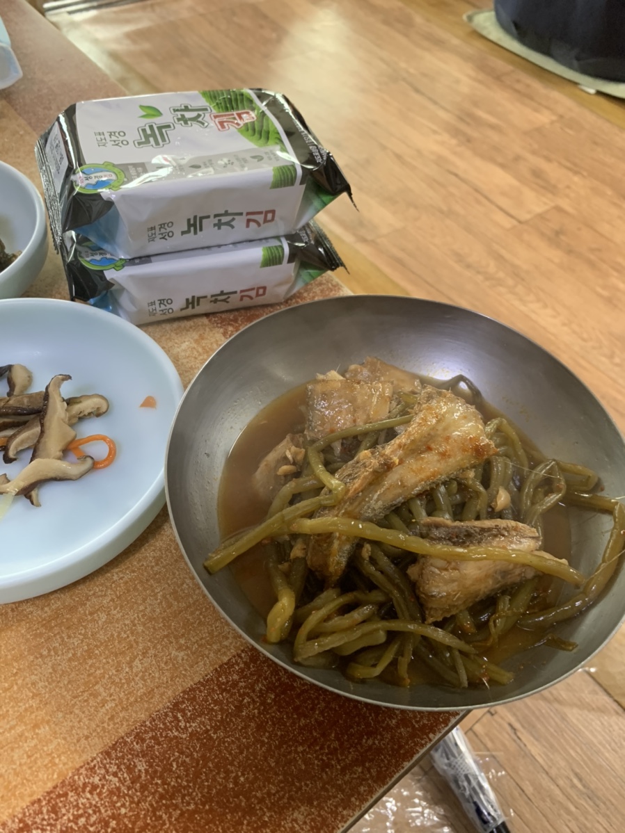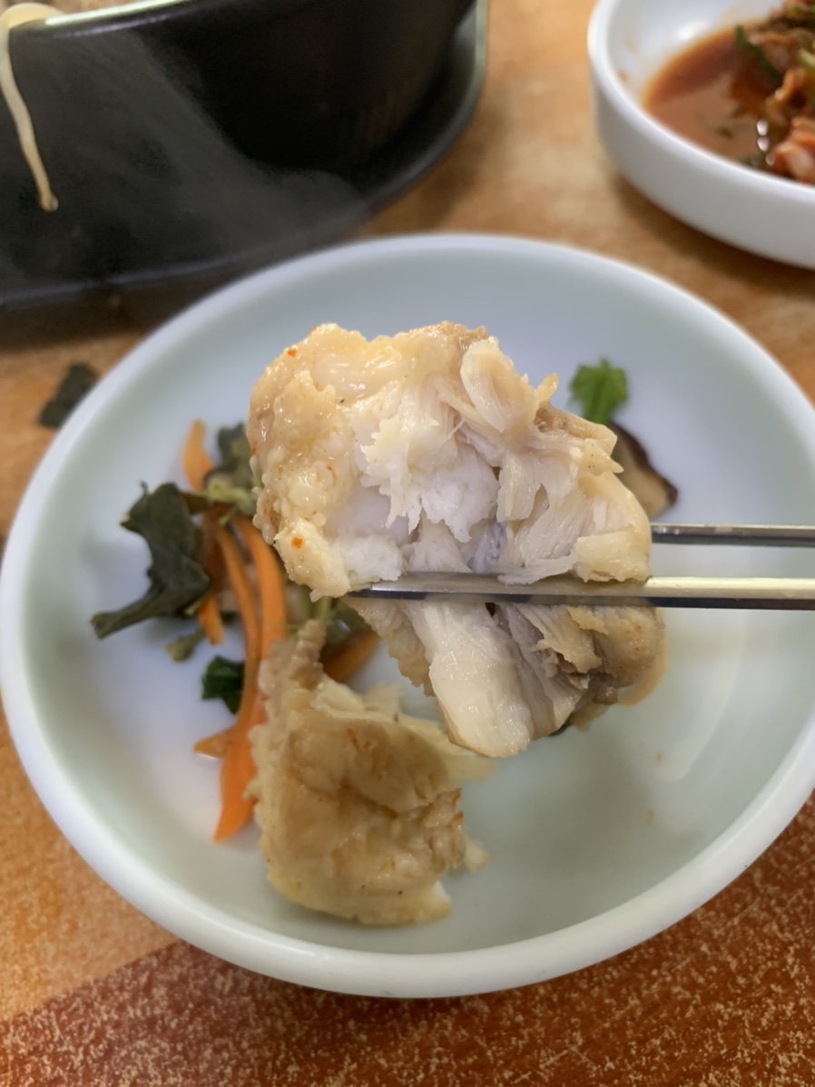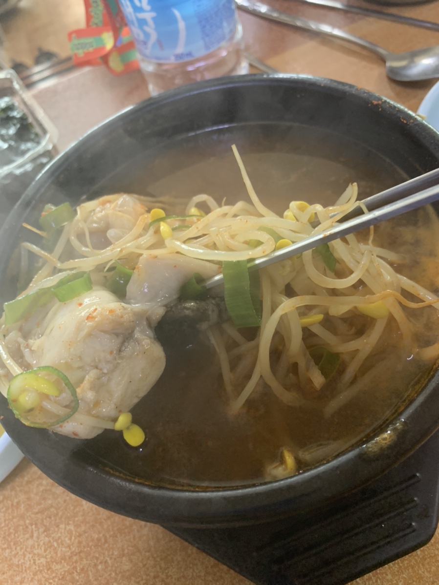 기본 반찬 18가지는 비슷한 반찬도 있었지만, 한상 대접받는 느낌이 들더군요. 기본? 반찬들은 오이냉국만(식초가 너무 과하게 들어가서...) 제외하고는 대부분 맛이 괜찮았습니다. 괜찮다기 보다 훌륭했습니다. 그리고 추가로 나온 김, 고구마 순 갈치조림 백반의 하이라이트!!! 콩나물 김치찌개가 나왔으려나 하고.... 생각했었는데!!! 콩나물이 들어간 아귀탕이 나왔네요. 와우!!!