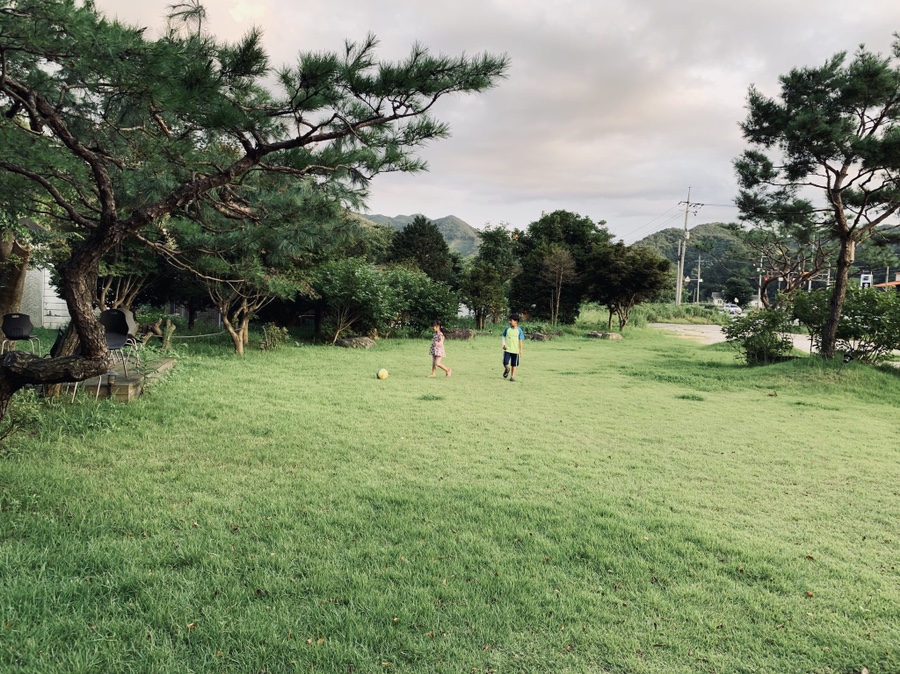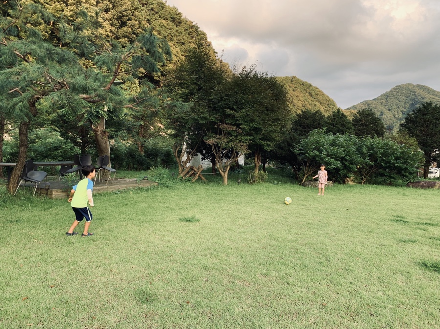 음식을 주문하고 25분 정도 시간이 소요된다고 하더군요. 식당에 우리 가족밖에 없는데, 메뉴 2개 25분이 걸리다니^^ 좀 오래 걸리기는 합니다. 그렇게 바쁘지 않아서 기다리기로 하고, 식당 앞 잔디에서 아이들과 공놀이를 좀 하다가 들어오니 식사가 준비되었네요.