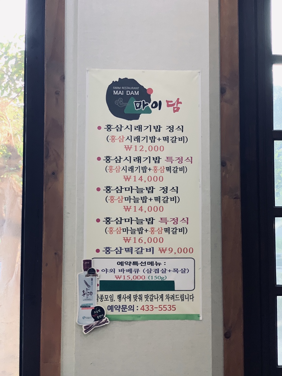 진안 마이산 등산을 마치고 가족들과 저녁식사를 해결하기 위해 방문한 식당입니다. 식당 내부에 손님이 아무도 없어서..... 장사를 안 하는 줄 알았네요. 너무 텅 빈 식당 내부 다른 식당을 가려다 한 끼 때우자는 생각에 자리에 앉았네요. 간단히 저녁을 해결하려고 시래기밥에 왔는데, 음식 가격이 ㄷㄷ 좀 비싸네요.ㅎㅎ 홍삼 시래기밥 정식 12,000원, 홍삼 마늘밥 정식 14,000원 하나씩 주문해 보았습니다.