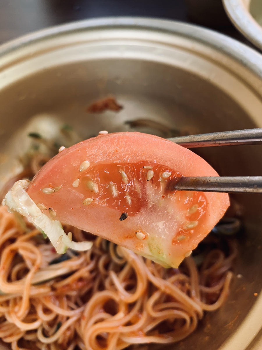 비빔국수는 국수 위 올려져 있는 토마토가 포인트더군요. 비빔국수 양념도 적정한 매콤함과 달달함의 균형이 맞추어져 있어서 맛있게 먹었네요. 그렇다고 7,000원까지 내고 먹을 정도는 아니고, 한 번 정도 방문해서 맛볼만한 정도였습니다.