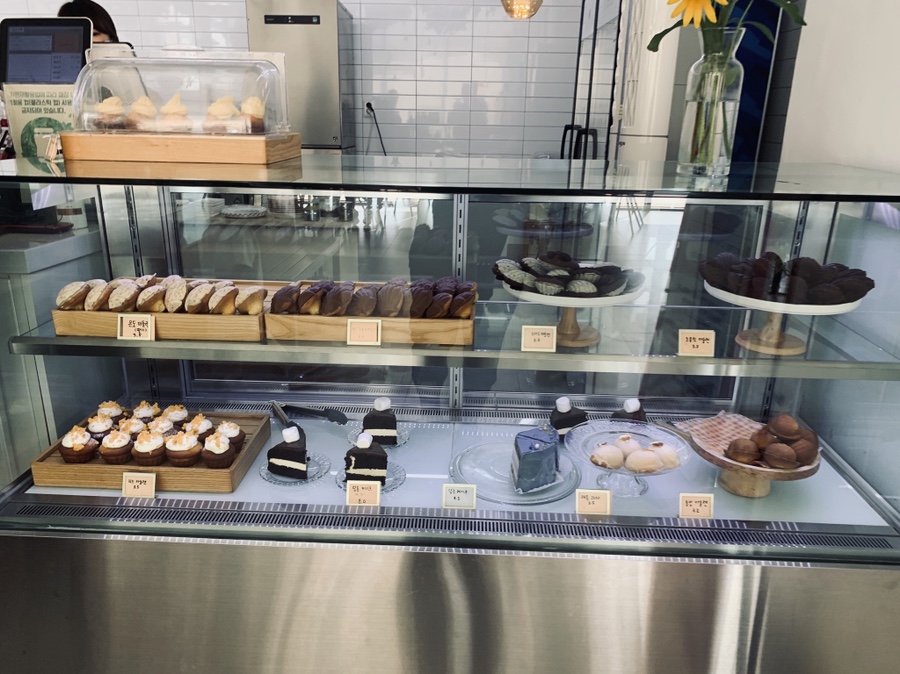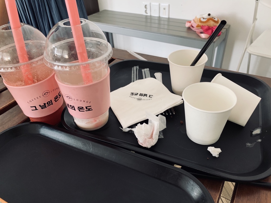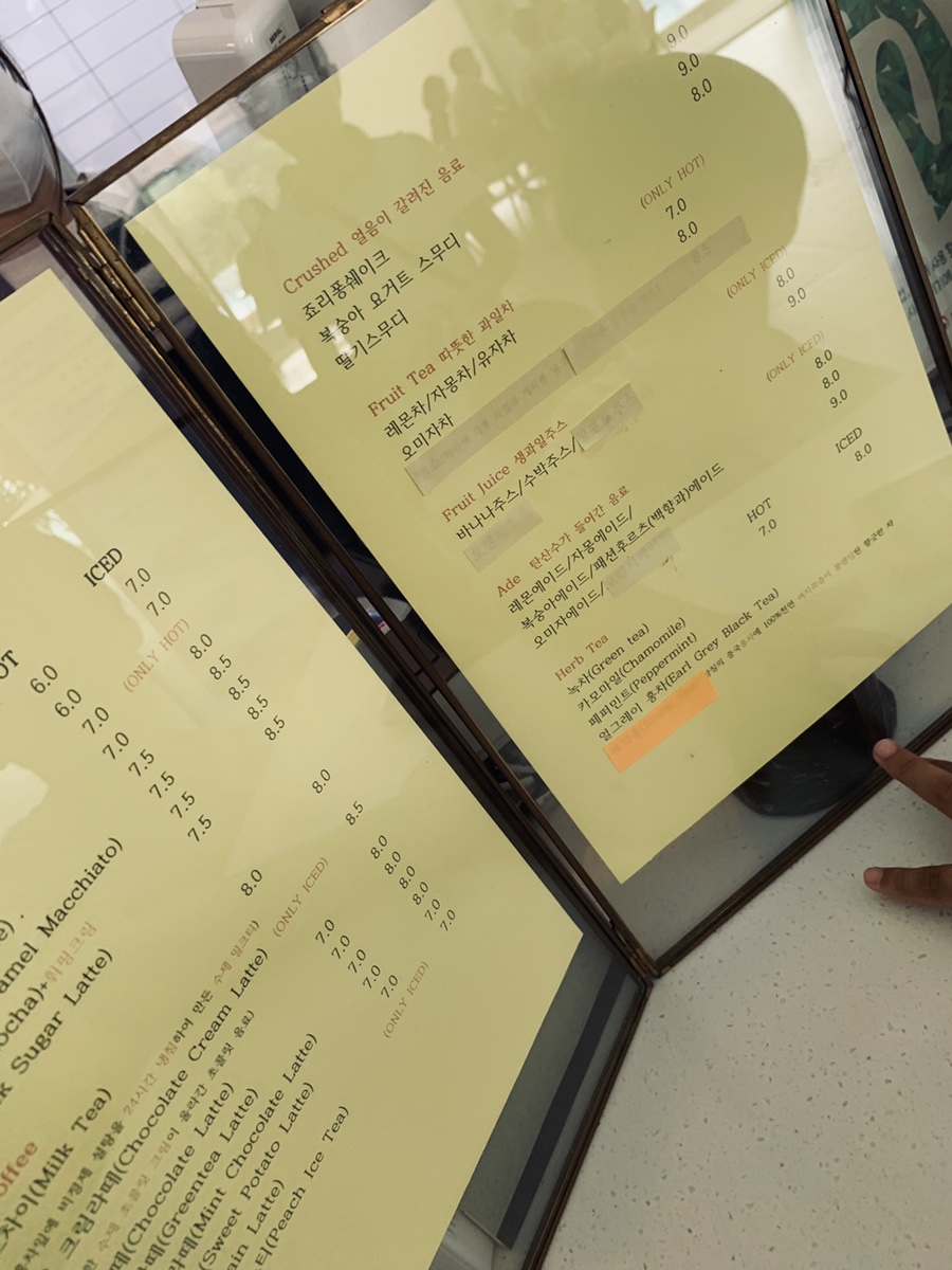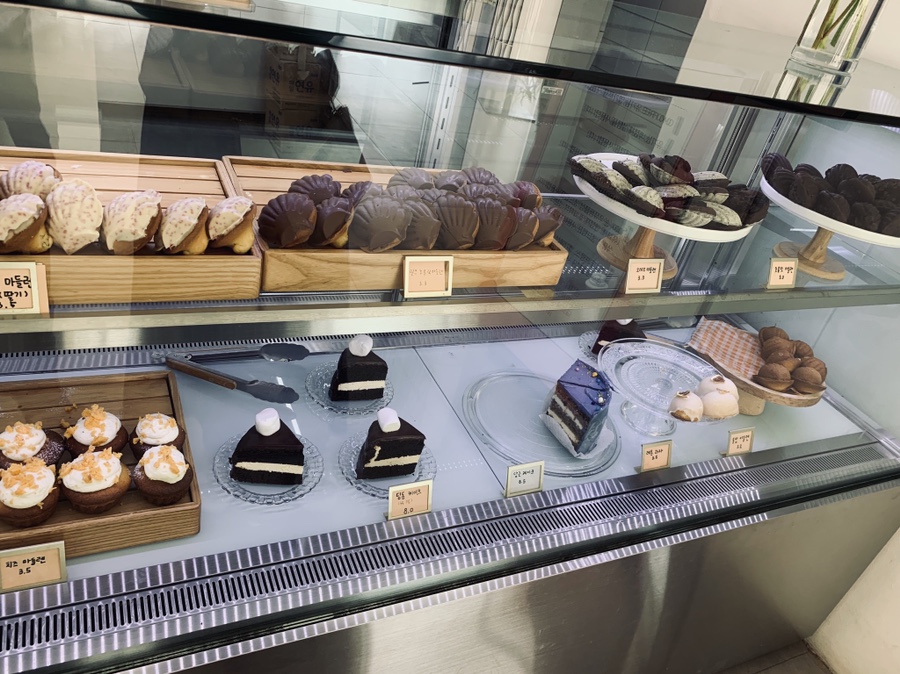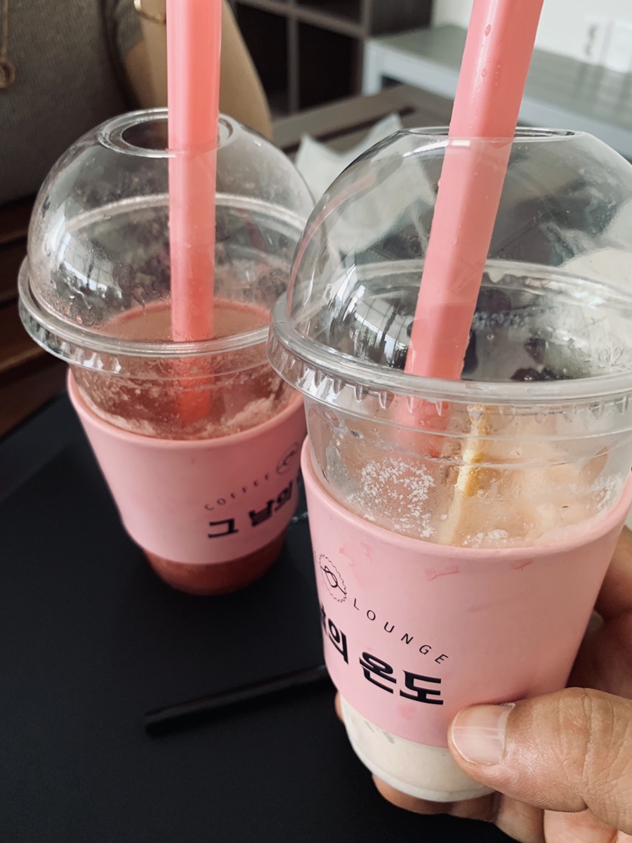 카페 내부에 빈자리가 없어서 한참을 기다려 자리를 맡고서, 음료를 주문하러 카운터로 향했습니다. 카운터에도 음료를 주문하기 위해 사람들이 줄!!! 서있더군요. 딸기 스무디 8,000원, 복숭아 요구르트 스무디 9,000원, 조개 모양 쿠키? 3,500원 2개 주문했네요. 가격은 꽤 비싼 편이네요.