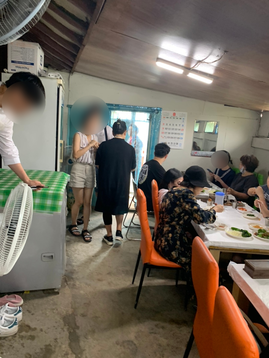 휴가철이라 그런지 많은 손님들이 대기하고 식사를 하고 계시더군요. 먼저 식사한 손님들 상차림을 보니, 반찬이 많지는 않지만, 맛있어 보이더군요. 기본 반찬이 나오는데, 기존 밥상과 다르게 밑반찬이 몇 가지 안 나오더군요. 손님이 많아서 그런지 반찬이 떨어져 안 나오나 봅니다. 우선 기본 반찬으로 고구마순 김치!! 평소에 좋아하는 반찬으로....... 고구가 줄기가 반절만 까져 있어서, 질기더군요.ㅠㅠ