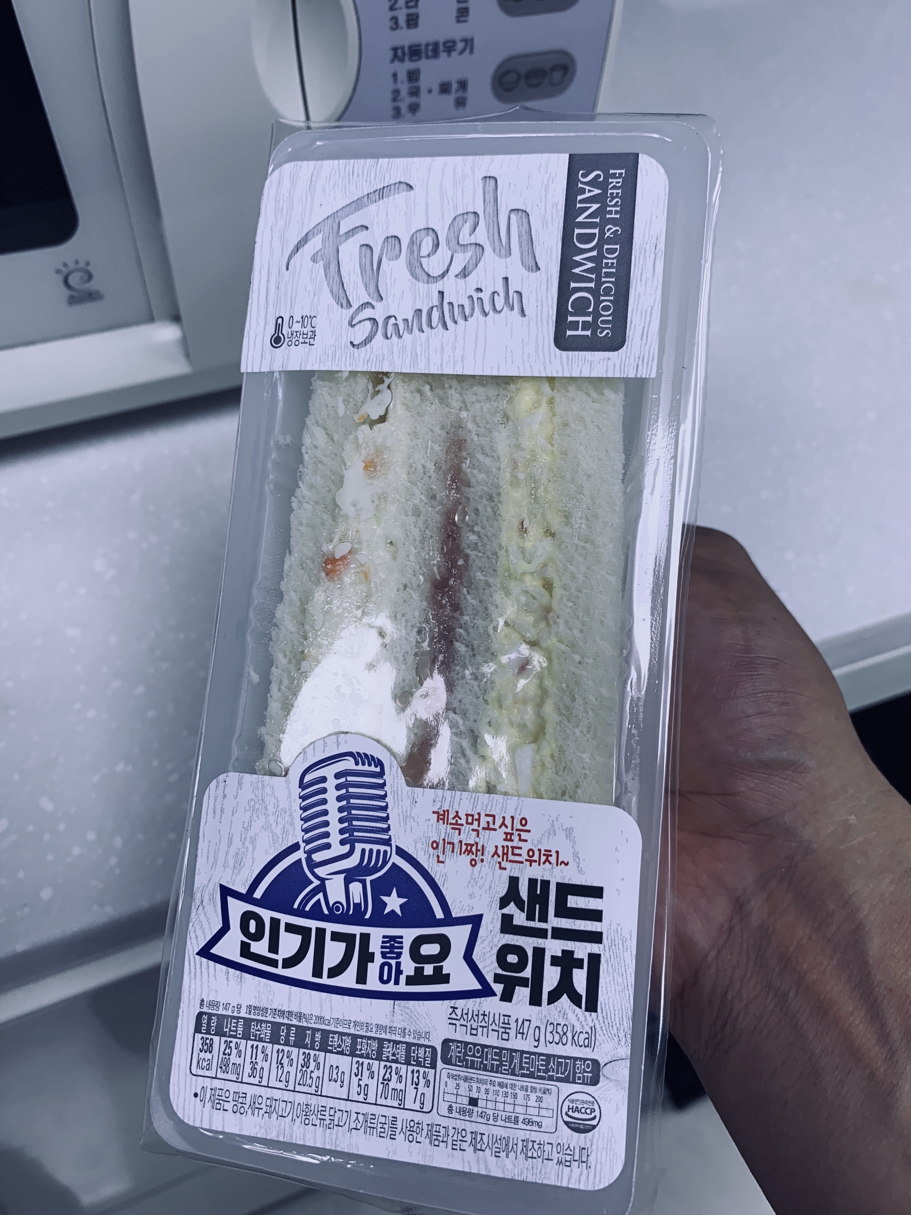 샌드위치는 비닐커버를 살짝 열고 전자레인지에 20초 돌려주면 완성! 평소 샌드위치는 그냥 먹기도 하는데, 그냥 먹을 때 빵 부분이 퍼석하여 살짝 익혀서 먹곤 하는데, 익혀서 먹은 후 그냥은 퍽퍽해서 못 먹겠더군요. 전자랜지에 살짝 익혀서 겉따속차(겉은 따뜻하고 속은 차가운) 상태에서 먹어야 입에 부드럽게 들어가더군요.