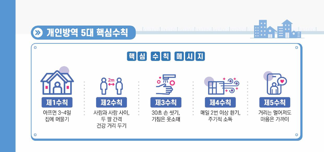 * 생활 속 거리두기 기본 수칙으로 "개인 방역 5대 핵심 수칙"을 정해두었습니다.