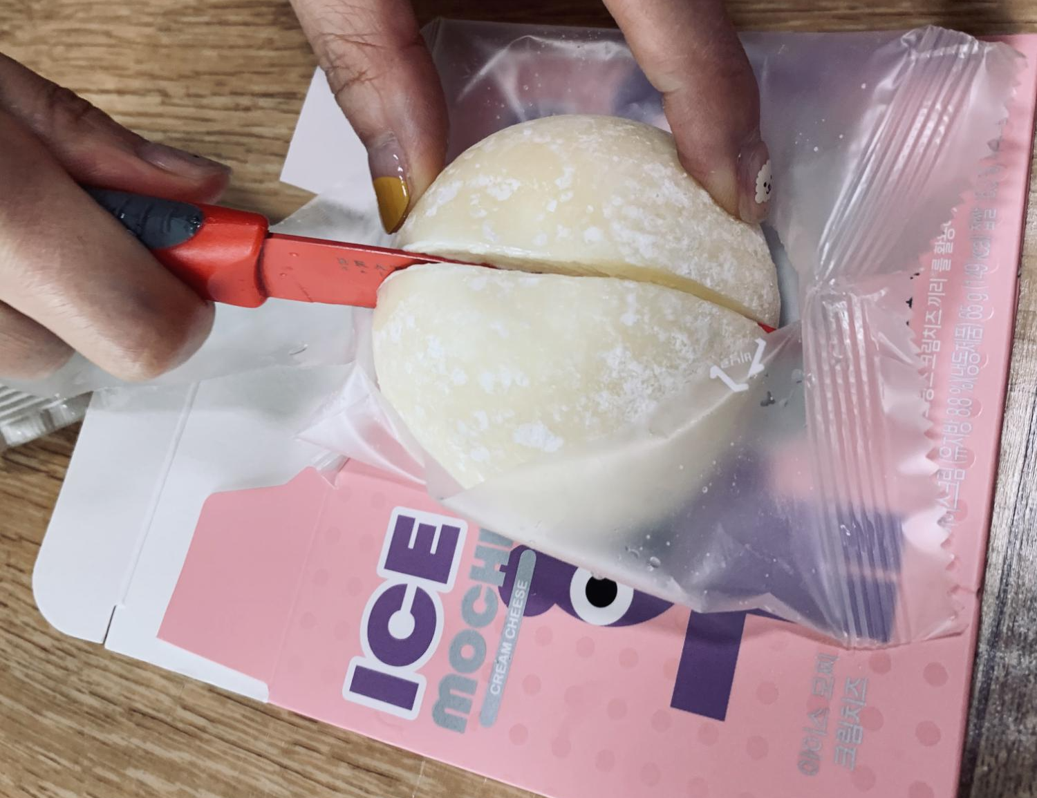 찹쌀떡은 한입에 먹기에는 좀 부담스럽습니다. 가격이 비싸서 한입에 먹기 아깝기도 하지만;;; 한입에 먹다가 목에 걸려 즉사할 수 도 있어서!!! 사이좋게 정확히 잘라서 나누어 먹어야 합니다. ㅎㅎ 이 조그마한 찹쌀떡 아이스크림이 2,800원이라니.... 아이들과 먹으면 아이스크림 순삭 3개는....... 흔적을 찾기 어려움!