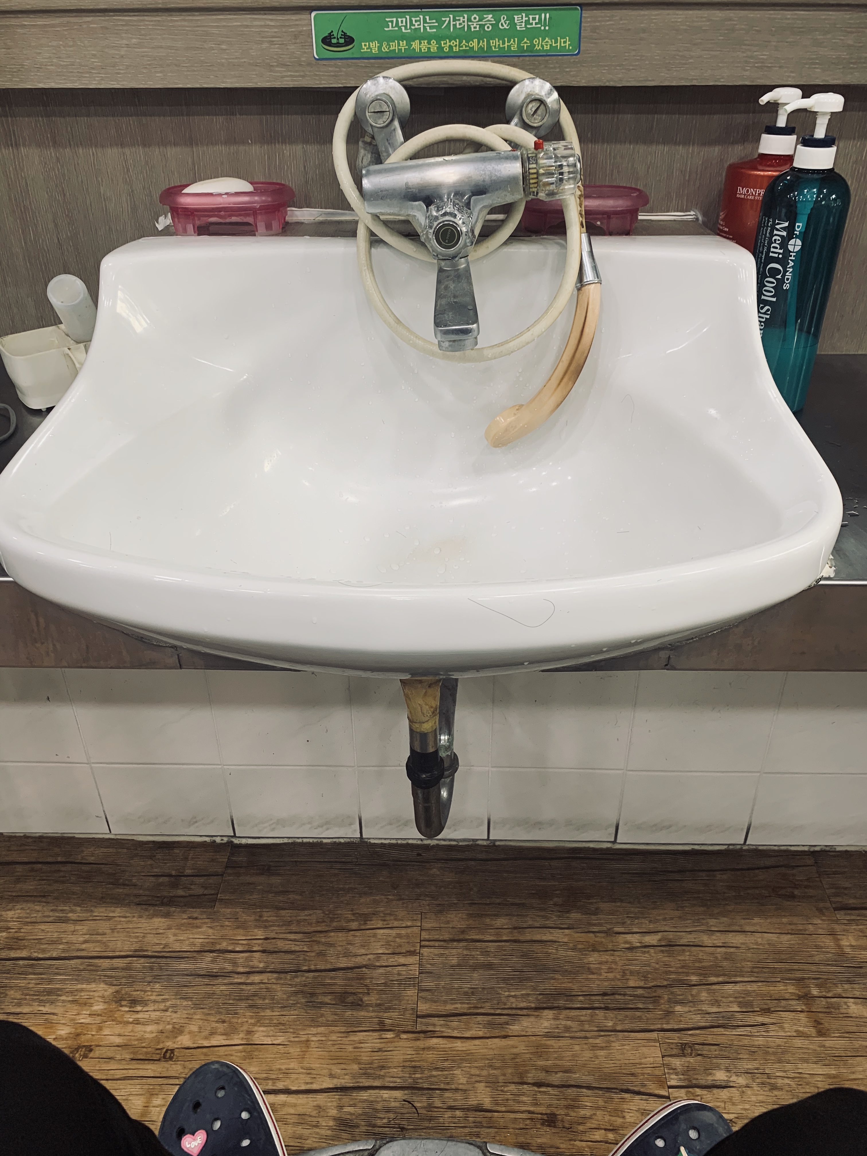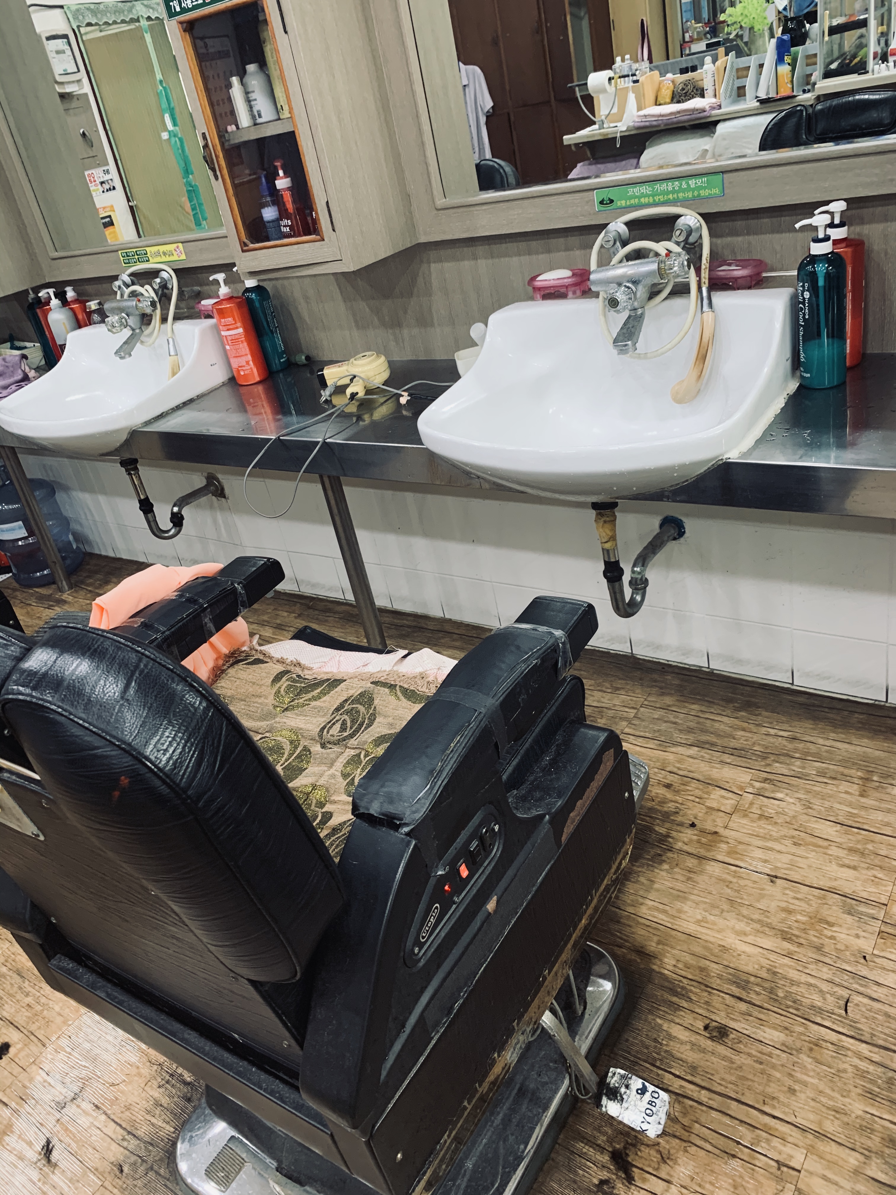 출입구에는 모기장? 가림막이 있고, 모기장 가름막을 밀고 들어가면 이용원이 나옵니다. 이용원에 들어가 가장 눈에 띄는 물품은 당연 이용원 의자와 의자 앞에 설치된 세면대입니다. 의자에 앉으면 올인원으로 해결되는 이용원 시스템을 느끼실 수 있으실 겁니다.ㅎㅎ 앉아서 머리 깎고, 숙이면 머리 감고..... 혁신적인 올인원 이용원 의자 시스템!^^